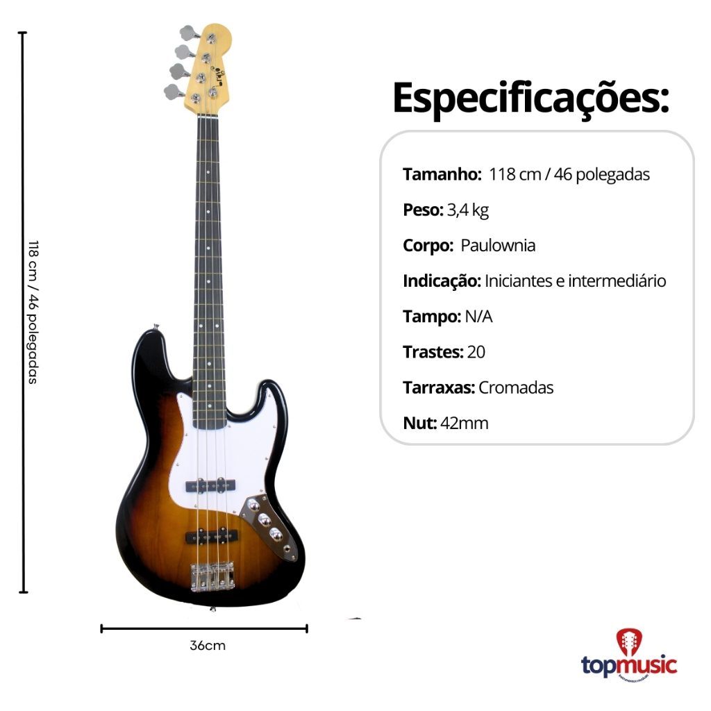 Kit Contra Baixo Bravo 4 Cordas Bb100 Passivo + Acessórios Descubra o equilíbrio perfeito entre design clássico, conforto e sonoridade marcante com o Contrabaixo Bravo BB100. Este kit completo é ideal para iniciantes, estudantes e músicos que buscam um ótimo custo-benefício sem abrir mão da qualidade. Com o BB100, você terá em mãos um instrumento que oferece leveza e excelente tocabilidade, graças ao corpo e braço em paulownia e à escala em techwood com 20 trastes. Equipado com 2 captadores single coil estilo Jazz Bass, ele proporciona timbres limpos e versáteis, ideais para estilos como pop, rock, jazz, gospel e funk. Os controles de 2 volumes e 1 tone permitem moldar o som com liberdade, enquanto a ponte e tarraxas cromadas garantem estabilidade e um visual sofisticado. O Bravo BB100 é um contrabaixo elétrico que se destaca pela sua construção robusta e materiais de alta qualidade. O corpo em paulownia sólida e a escala em techwood oferecem uma resposta suave e precisa, enquanto o acabamento em verniz brilhante proporciona um visual profissional e resistente. Este instrumento é perfeito para uso em casa, aulas, ensaios, gravações ou apresentações ao vivo em igrejas e eventos. ESPECIFICAÇÕES TÉCNICAS: - Tipo de baixo: Elétrico - Profundidade do corpo: 4 cm - Comprimento do corpo: 118 cm - Largura do corpo: 36 cm - Tipo de madeira do corpo: Paulownia sólida - Tipo de ponte: Standard - Quantidade de trastes: 20 - Linha: BB - Modelo: Bb100 - Tipo de madeira do braço: Paulownia - Quantidade de captadores: 2 - Tipo de captadores: Single coil - Tipo de equalização dos captadores: Passivo - Comprimento da escala: 625 mm - Origem: China ITENS INCLUSOS: - Contrabaixo Bravo 4 Cordas BB100 Passivo Jazz Bass - Capa de luxo acolchoada com alça mochila - Correia marrom lisa - Afinador digital - Cabo P10 P10 emborrachado com 5 metros - Chaves de ajuste do tensor e da ponte INSTRUÇÕES DE USO: 1. Ajuste o tensor para garantir a curvatura ideal do braço. 2. Utilize as chaves de ajuste para regular a altura das cordas na ponte. 3. Mantenha o instrumento limpo e seco para prolongar sua vida útil. 4. Experimente diferentes configurações de volume e tone para explorar a versatilidade sonora. GARANTIA: Produto original com nota fiscal e garantia de 90 dias em todo o Brasil. Garanta já o seu kit completo Bravo BB100 e comece a tocar com qualidade e estilo desde o primeiro dia! Não perca a oportunidade de adquirir um instrumento que combina design, conforto e sonoridade excepcional. Estoque limitado!
