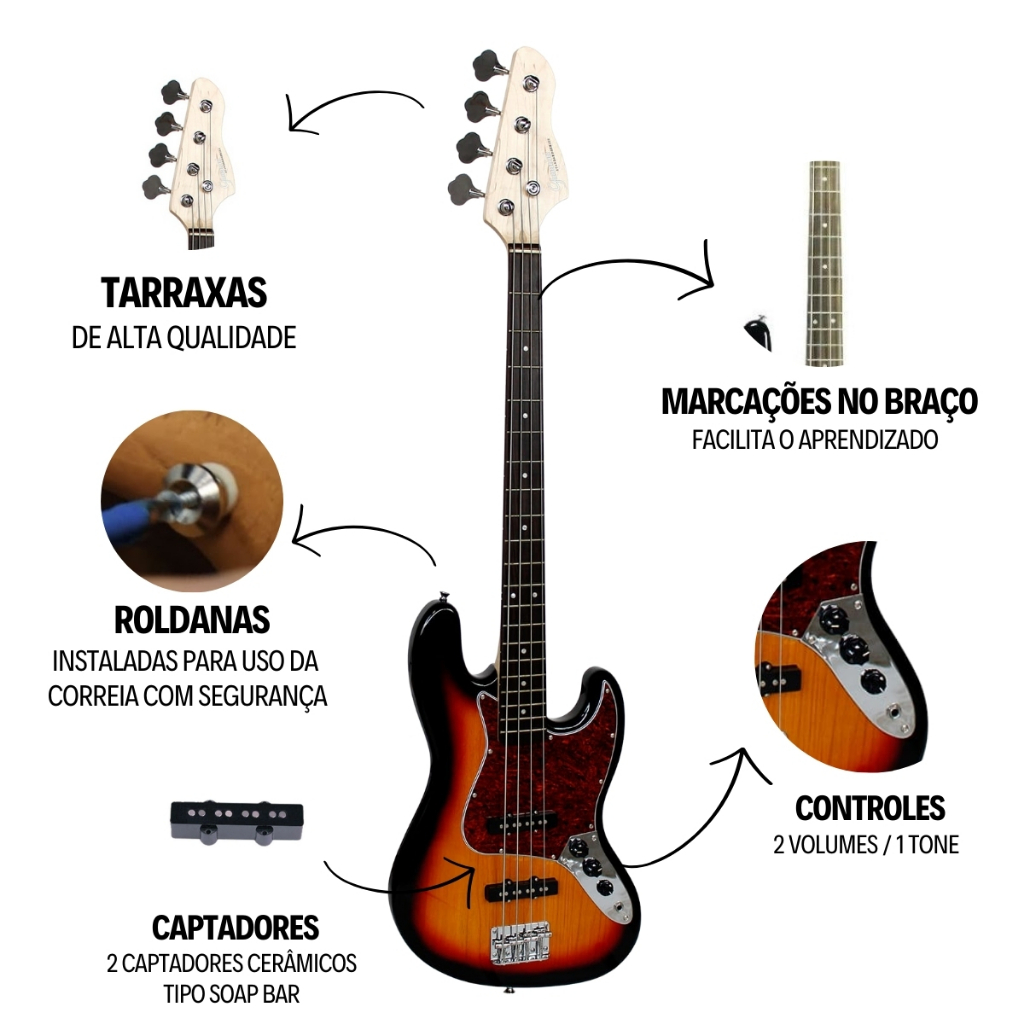 Kit Contra Baixo Giannini 4 Cordas Gb100 Passivo Jazz Bass + Acessórios + Amplificador Sheldon