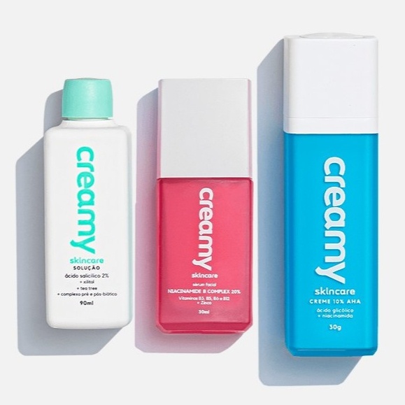 Kit Controle de Poros Reduz poros dilatados e melhora a textura da pele Ácido glicólico + Ácido Salicílico + Niacinamida O Ácido Salicílico da Creamy é uma solução tônica antiacne que traz o ácido salicílico a 2% numa textura líquida, ideal para ser usada logo após a limpeza da pele. Pode ser aplicada sozinha ou em combinação com outros tratamentos, tanto pela manhã, quanto a noite. Esse tônico reduz imediatamente a oleosidade, desobstruindo os poros e fazendo uma esfoliação química superficial, que evita a formação de cravos e espinhas. Traz um complexo que equilibra a microbiota da pele, impedindo a proliferação de bactérias nocivas, como a bactéria causadora da acne. Traz ainda ingredientes suavizantes e calmantes que tornam essa solução segura para as peles mais sensíveis, regulando a oleosidade sem ressecar. NIACINAMIDE B COMPLEX 20% é um sérum ultraconcentrado com 20% de um blend de vitaminas (B3, B5, B6, B12 e E) que age no fortalecimento da barreira cutânea, melhorando a aparência, textura e tonalidade da pele. Contém uma tecnologia tripla de entrega da niacinamida (vitamina B3) que atua em todas as camadas da pele e, aliada ao zinco, controla a oleosidade excessiva, reduz a aparência de poros dilatados e auxilia no controle da acne. Garante também a uniformização da pele e o aumento da hidratação, além de ajudar a aliviar a sensação de desconforto e sensibilidade. Indicado para todos os tipos de pele, incluindo as mais sensíveis. O ácido glicólico é um renovador celular facial em creme com 10% de ácido glicólico. Atua para retexturizar a pele por meio da esfoliação química. É o tratamento facial ideal para a prevenção e correção dos primeiros sinais de envelhecimento. Renova as células enquanto garante uma hidratação profunda, além de potencializar a absorção dos demais tratamentos. Uniformiza a textura e o tom da pele. Formulado para hidratar, esfoliar e iluminar a pele do rosto e do pescoço, o glicólico da Creamy suaviza e previne os sinais do envelhecimento, promovendo uma aparência e textura mais suaves. Por meio da renovação celular, este creme estimula a produção de colágeno. nas camadas mais profundas e ajuda a reparar o dano causado pela idade, pelo sol e pelas agressões do dia a dia. Contém Vitamina B3 (Niacinamida), ativo que melhora a barreira cutânea, tem atividade clareadora e propriedades seborreguladoras. Contribui para a melhora de manchas da pele, redução do excesso do brilho e prevenção de acne.