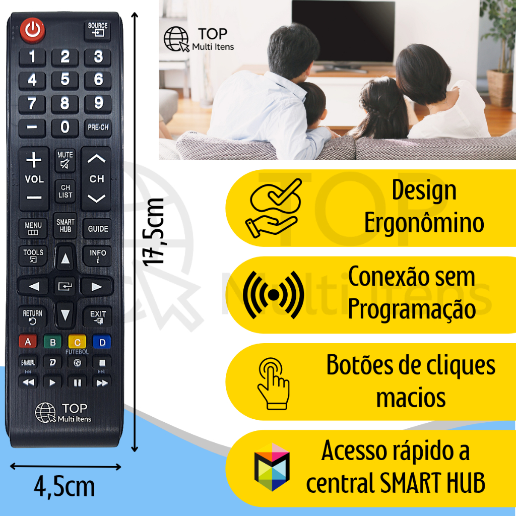 Controle Remoto Compatível com TV Samsung Smart Hub (Modelos 7028 / 8008 / 7036) – Pronto para Uso! Chegou, colocou as pilhas e usou! Não precisa de configurações complicadas, pareamento ou códigos de programação. O GRANDE DIFERENCIAL: COMPATIBILIDADE UNIVERSAL SAMSUNG Este controle utiliza a exata mesma frequência de códigos infravermelhos da fabricante. Isso significa que as funções principais (LIGA/DESLIGA, MENU, INPUT, VOL, CH, etc.) funcionam em praticamente 100% das TVs Samsung, independente da geração! Não importa o modelo da sua televisão, ele é compatível com: TVs de Tubo (antigas) TVs de Plasma TVs LCD e LED Smart TVs modernas (Nota: Para que os botões de atalhos Smart específicos funcionem perfeitamente, basta que o seu controle original seja visualmente semelhante a este). ATENÇÃO ÀS VARIAÇÕES DESTE ANÚNCIO: Para facilitar sua compra e garantir o melhor preço, oferecemos diferentes opções. Escolha a sua na hora de adicionar ao carrinho: 1 Controle + 2 Pilhas AAA (Ideal para reposição rápida). Kit 2 Controles + 4 Pilhas AAA (O melhor custo-benefício para estar preparado para os imprevistos do dia a dia: o controle caiu e quebrou, a criança escondeu, o cachorro mordeu ou simplesmente sumiu no sofá!). PRINCIPAIS VANTAGENS: Pilhas Inclusas: Receba o produto e já comece a usar, sem precisar ir ao mercado. Teclas de Atalho: Acesso rápido às funções Smart (Verifique a foto do controle para confirmar os botões). Material Resistente: Plástico de alta qualidade e teclas macias de borracha. Tempo de Resposta Rápido: Transmissão via infravermelho com excelente alcance. O QUE VOCÊ VAI RECEBER: Controle Remoto (Quantidade conforme variação escolhida). Pilhas AAA Inclusas (Quantidade conforme variação escolhida). POR QUE COMPRAR COM A TOP MULTI ITENS? Produtos testados e conferidos rigorosamente antes do envio. Estoque a pronta entrega. Envio rápido e seguro. Atendimento humanizado e focado na sua satisfação.