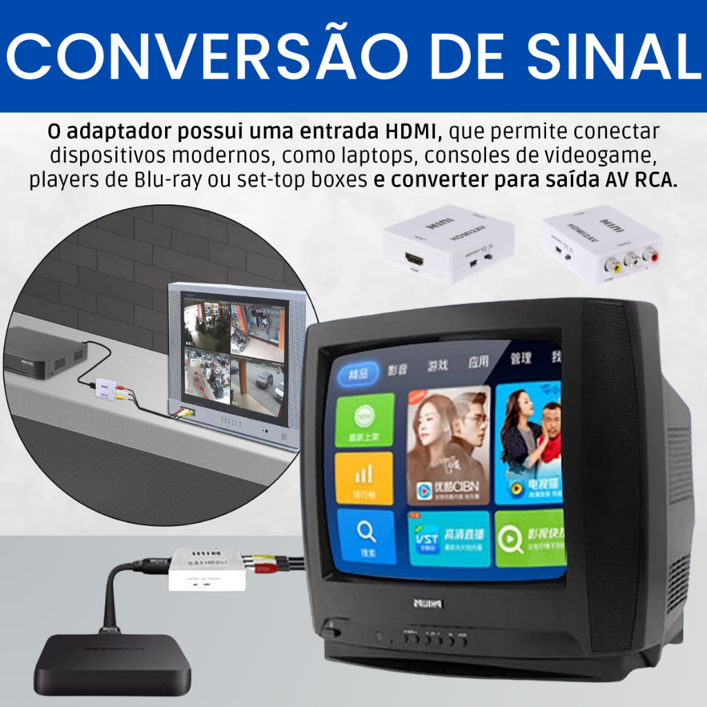 Atualize sua TV antiga com o Kit Conversor HDMI para RCA + Cabos RCA e HDMI. Aproveite a melhor qualidade de imagem e som dos seus dispositivos modernos em sua TV clássica. Fácil de instalar e compatível com várias entradas, este kit é a solução completa para sua TV antiga. COMPRE AGORA! Se sua TV ainda utiliza entrada AV (RCA), o Kit Adaptador Conversor HDMI para RCA é a solução ideal para conectar videogames, TV Box, notebooks, DVDs, sistemas de câmeras e outros dispositivos HDMI. Fácil de instalar e compatível com diversos equipamentos, esse kit melhora a qualidade de imagem e som da sua TV clássica sem necessidade de troca. Benefícios: - Compatibilidade ampla – Funciona com videogames, TV Box, notebooks, DVDs e mais; - Fácil instalação – Conexão simples e rápida, sem necessidade de configurações complicadas; - Qualidade de imagem e som – Experiência otimizada para TVs com entrada RCA; - Alimentação via USB – Dispensa o uso de adaptadores adicionais. Conteúdo da embalagem: - 1 Adaptador HDMI para AV (RCA, Composite, CVBS); - 1 Cabo USB para alimentação; - 1 Cabo HDMI de 1 metro; - 1 Cabo RCA colorido (amarelo, vermelho e branco). Garanta agora o seu Kit Mini Conversor HDMI para AV RCA.