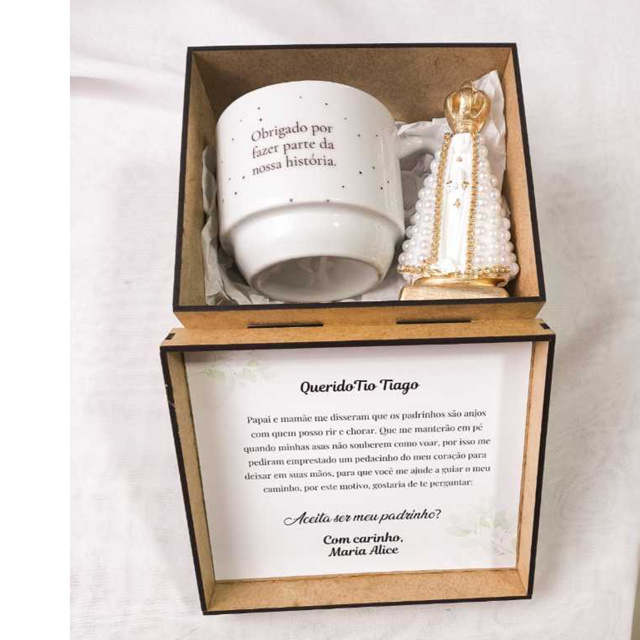 Kit Convite de Padrinho de Batismo ou Casamento com Xícara + Nossa Senhora em Gesso + Caixa MDF