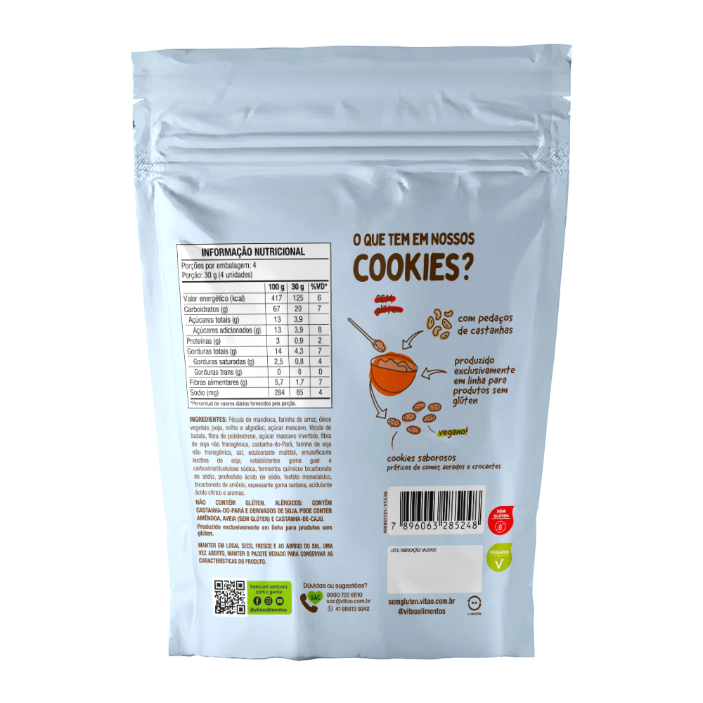 Os Cookies Sem Glúten Castanha-do-Pará 120 g da Vitao são uma deliciosa opção de lanche saudável para quem busca uma alimentação sem glúten, sem abrir mão do sabor. Feitos com ingredientes naturais e cuidadosamente selecionados, esses cookies combinam a crocância das castanhas-do-Pará com uma textura macia e sabor irresistível. Além de serem livres de glúten, esses cookies também são uma excelente fonte de gorduras saudáveis, fornecidas pelas castanhas do Pará, que são ricas em nutrientes como vitaminas, minerais e antioxidantes. Eles são ideais para quem segue uma dieta restritiva, sem comprometer o prazer de comer um doce saboroso. Perfeitos para o lanche da tarde ou como opção para o café da manhã, os Cookies Sem Glúten Castanha-do-Pará da Vitao são uma alternativa nutritiva, prática e deliciosa para qualquer momento do dia. Pode ser usado como base para sobremesas, como tortas e pavês, ou esfarelado sobre sorvetes e mousses para um toque especial INGREDIENTES: Fécula de mandioca, farinha de arroz, açúcar mascavo, óleos vegetais (soja, milho e algodão), fécula de batata, gotas de cobertura sabor chocolate sem lactose, fibra de polidextrose, açúcar mascavo invertido, fibra de soja não transgênica, farinha de soja não transgênica, sal, edulcorante maltitol, emulsificante lecitina de soja, estabilizantes goma guar, carboximetilcelulose sódica e poliglicerol polirricinoleato, fermentos químicos bicarbonato de sódio, pirofosfato ácido de sódio, fosfato monocálcico e bicarbonato de amônio, espessante goma xantana, acidulante ácido cítrico e aroma. ALÉRGICOS: CONTÉM CASTANHA-DO-PARÁ E DERIVADOS DE SOJA. PODE CONTER AMÊNDOA, AVEIA (SEM GLÚTEN) E CASTANHA-DE-CAJU. NÃO CONTÉM GLÚTEN. SEM GLÚTEN, VEGANO.