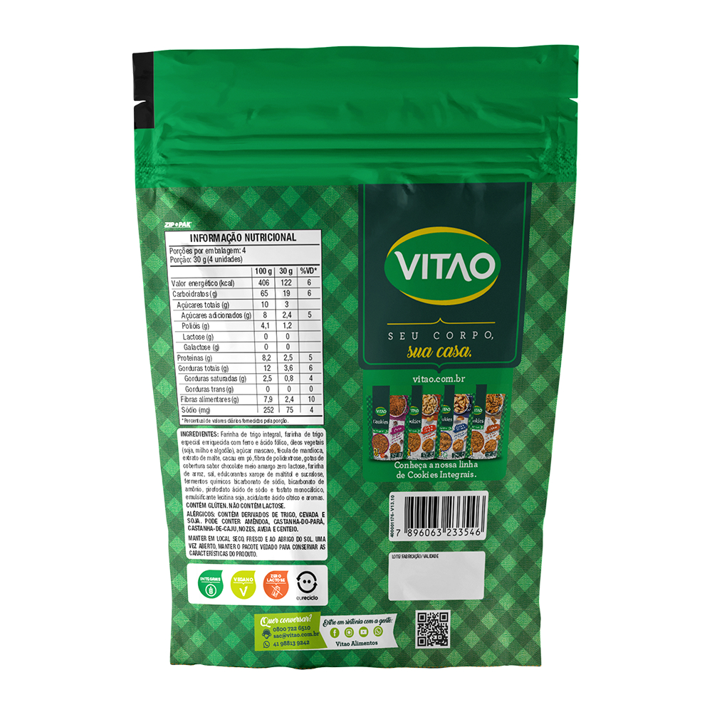 Leves e crocantes, os Cookies Integrais Vitao são elaborados com farinha de trigo integral, açúcar mascavo e ingredientes naturais, sem adição de aromas artificiais, o que os torna ainda mais saudáveis e saborosos. Com uma trajetória pioneira no Brasil, os cookies Vitao já conquistaram o paladar dos brasileiros, sendo reconhecidos por sua tradição no mercado. Seu aspecto mais artesanal e natural se destaca quando comparado aos demais, oferecendo uma experiência única de sabor e textura. Perfeitos para o café da manhã, lanches ou qualquer momento do dia, os Cookies Integrais Vitao são a escolha ideal para quem busca praticidade e sabor de forma saudável, sem abrir mão da qualidade. Experimente os cookies Vitao como um lanche da tarde acompanhado de uma fruta ou como parte de um café da manhã nutritivo. INGREDIENTES: Farinha de trigo integral, farinha de trigo especial enriquecida com ferro e ácido fólico, óleos vegetais (soja, milho e algodão), açúcar mascavo, fécula de mandioca, extrato de malte, cacau em pó, fibra de polidextrose, gotas de cobertura sabor chocolate meio amargo zero lactose, farinha de arroz, sal, edulcorantes xarope de maltitol e sucralose, fermentos químicos bicarbonato de sódio, bicarbonato de amônio, pirofosfato ácido de sódio e fosfato monocálcico, emulsificante lecitina de soja, acidulante ácido cítrico e aromas. ALÉRGICOS: CONTÉM DERIVADOS DE TRIGO, CEVADA E SOJA.PODE CONTER AMÊNDOA,CASTANHA-DO-PARÁ, CASTANHA-DE-CAJU, NOZES, AVEIA E CENTEIO. CONTÉM GLÚTEN. INTEGRAL, ZERO LACTOSE, VEGANO.