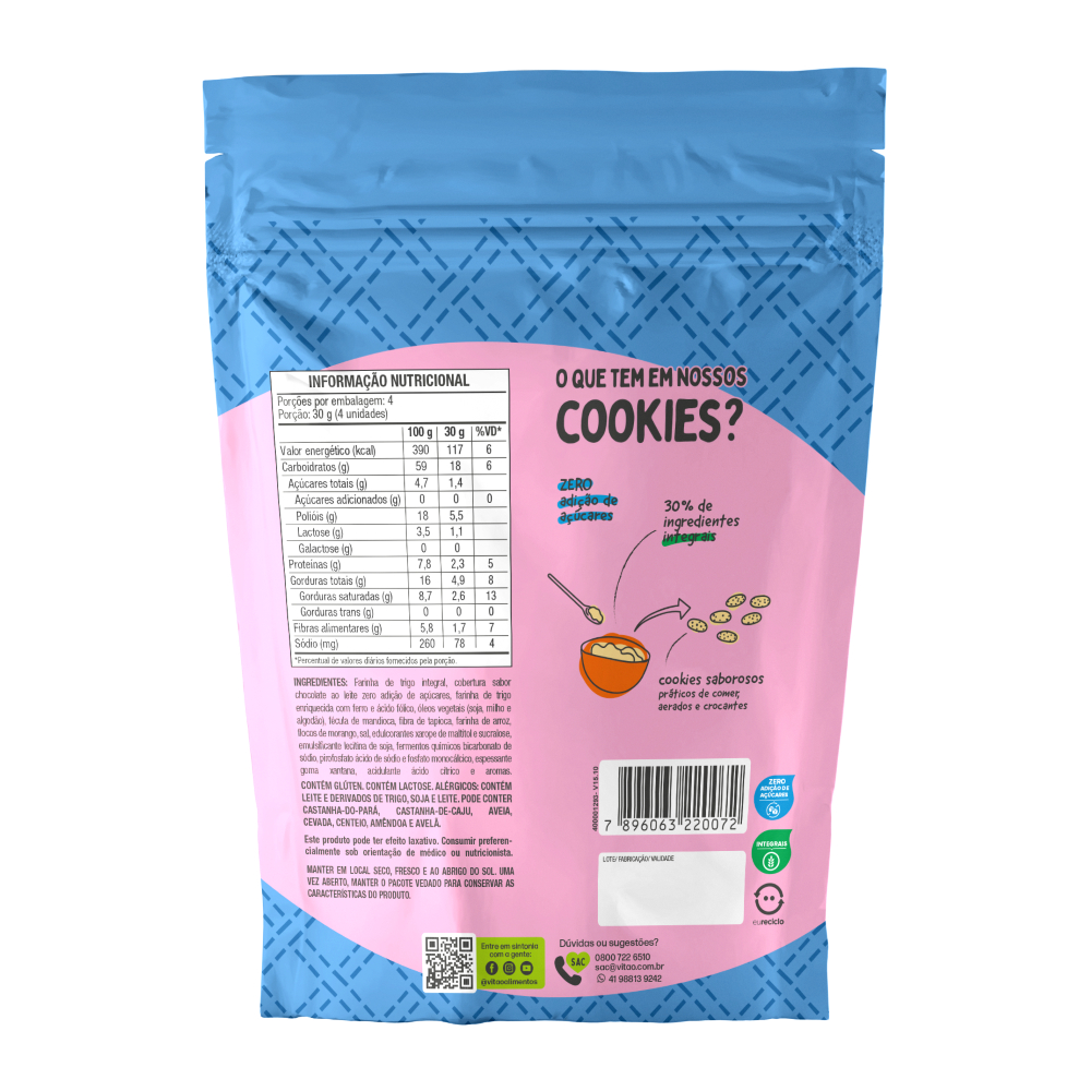 Os Cookies Integrais Zero Açúcares de Morango com Cobertura de Chocolate são uma combinação perfeita de sabor e saúde. Elaborados cuidadosamente, esses Cookies foram pensados para quem segue uma dieta sem açúcar ou adota um estilo de vida focado no bem-estar. Feitos com ingredientes de alta qualidade, eles unem o frescor do morango à indulgência do chocolate, criando uma experiência de sabor única e equilibrada. Ideais para quem deseja saborear um doce delicioso sem abrir mão da saúde, esses biscoitos oferecem prazer e nutrição em cada mordida. INGREDIENTES: Farinha de trigo integral, cobertura sabor chocolate ao leite zero adição de açúcares, farinha de trigo enriquecida com ferro e ácido fólico, óleos vegetais (soja, milho e algodão), fécula de mandioca, fibra de tapioca, farinha de arroz, flocos de morango, sal, edulcorantes xarope de maltitol e sucralose, emulsificante lecitina de soja, fermentos químicos bicarbonato de sódio, pirofosfato ácido de sódio e fosfato monocálcico, espessante goma xantana, acidulante ácido cítrico e aromas. ALÉRGICOS: CONTÉM LEITE E DERIVADOS DE TRIGO, SOJA E LEITE. PODE CONTER CASTANHA-DO-PARÁ, CASTANHA-DE-CAJU, AVEIA, CEVADA, CENTEIO, AMÊNDOA E AVELÃ. CONTÉM GLÚTEN. CONTÉM LACTOSE. INTEGRAL, ZERO ADIÇÃO DE AÇÚCARES.