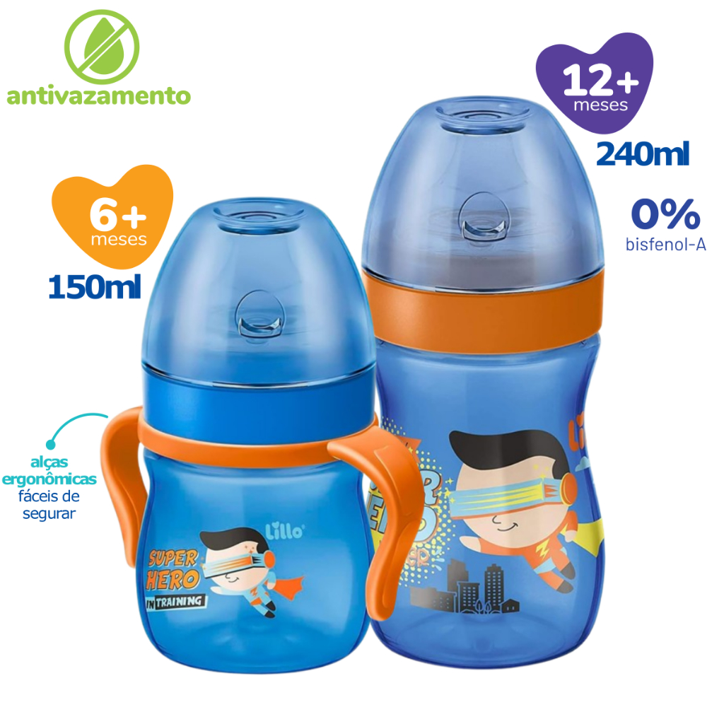 Kit Copos de Treinamento Transição Lillo Evolution 150/240 mL Antivazamento Bico Silicone Macio +6m