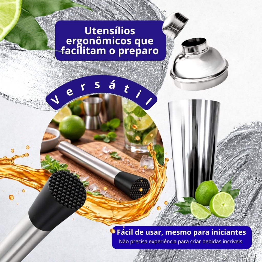 Kit Coqueteleira 750 ml + Socador+ Dosador Inox Profissional