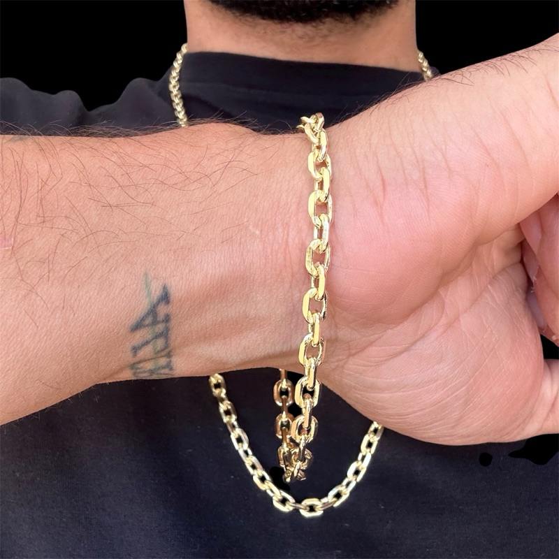 Corrente e Pulseira 100% Moeda Antiga! A Cor Dourada NUNCA sairá da peça, produto extremamente semelhante ao ouro 18k Conseguimos fazer esse preço bem abaixo do mercado porque somos fabricantes! Corrente cadeado de quina e Pulseira feitas à partir do material de moeda antiga, não perde a cor, não descasca e não enferruja, porém suja com frequência e necessita de limpeza na mesma intensidade. O cadeado com quina é ótimo para reflexão da luz o que dá mais brilho. Especificações: Milimetragem: 5mm Tamanho: 70cm Cordão e 21cm Pulseira (Aberto) Fecho Canhão A limpeza e mais informações podem ser solicitadas pelo chat. A frequência das limpezas variam de pessoa para pessoa podendo assim sujar muito ou pouco. Perguntas frequentes: - Posso tomar banho com o colar de mar ou piscina? Resposta: Pode sim, sem problemas! - Esse material Perde a cor? Resposta: Não! Sua cor é eterna, porém tem que manter sua limpeza! - O produto leva algum tipo de banho de ouro Resposta: Não! O material já é dourado normalmente e não leva banho de ouro! - Como efetuo a limpeza? Resposta: A limpeza é feita com vinagre e detergente, pode nos chamar no chat que enviaremos um vídeo ensinando a efetuar a limpeza! - Como é feito o envio? Resposta: Assim que for efetuada sua compra, nós aguardaremos a liberação da sua etiqueta que geralmente é feita em alguns minutos. Após isso efetuaremos seu envio o mais rápido possível, o fazemos todos os dias às 15 hrs, ou seja, se o seu pedido for efetivado até 12 00 am iremos fazer seu envio no mesmo dia.