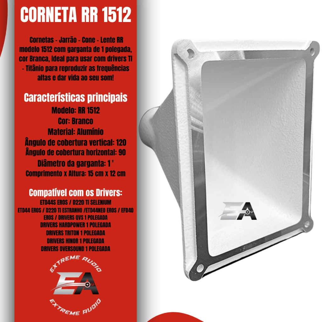 Cornetas - Jarrão - Cones - Lentes - RR modelo 1512 com garganta de 1 polegada, quadrada na cor Branca. Ideal para usar com drivers TI - Titânio para reproduzir as frequências altas e dar vida ao sistema. A função da corneta é amplificar e direcionar, tornando o driver mais eficiente e dando qualidade ao sistema. Produto novo com garantia de 30 dias por defeito de fabricação. ESCOLHA A QUANTIDADE: 06 UNIDADES 04 UNIDADES 02 UNIDADES 01 UNIDADE Marca: RR Modelo: 1512 *** SELECIONE A COR DESEJADA Cor: Branca OU Preto Formato: Quadrada Indicado: Para drivers com garganta em 1 polegada. Garganta: Rosca Compatível com os Drivers FENOLICO E TITÂNIO : ETD44S EROS D220 TI SELENIUM ETD44 EROS D220 TI ESTRANHO ETD44NEO EROS EFD40 EROS DRIVERS QVS 1 POLEGADA DRIVERS HARDPOWER 1 POLEGADA DRIVERS TRITON 1 POLEGADA DRIVERS HINOR 1 POLEGADA DRIVERS OVERSOUND 1 POLEGADA ENTRE OUTROS COM GARGANTA EM 1 POLEGADA.