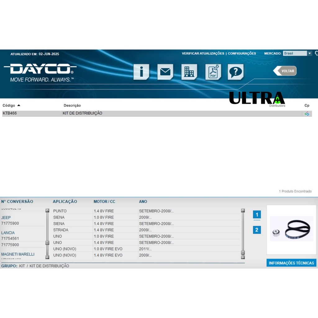 Kit Correia Dentada para Fiat Fire 1.4 8V Evo Uno / Mobi / Strada / Fiorino / Grand Siena / Siena / Idea / Doblo - 2008.. (Dayco KTB466) Aplicação compatível: - Compatível com FIAT 500 - 1.4 8V FIRE EVO - 2011 A 2018 FIAT DOBLO - 1.4 8V FIRE - 2009 A 2015 FIAT IDEA - 1.4 8V FIRE - 2009 A 2015 FIAT MOBI - 1.0 8V FIRE EVO (4 CILINDROS) - 2016 A 2021 FIAT PALIO ATTRACTIVE - 1.0 8V / 1.4 8V FIRE EVO – 2011 A 2018 FIAT PUNTO - 1.4 8V FIRE - 2008 A 2017 FIAT GRAND SIENA - 1.4 8V FIRE EVO – 2012 A 2016 FIAT STRADA - 1.4 8V FIRE E FIRE EVO - 2009 A 2021 FIAT UNO - 1.0 8V FIRE EVO – 2010 A 2016 FIAT UNO - 1.4 8V FIRE EVO - 2010 A 2016 Composto por: 129P8S220H TIMING BELT (CORREIA DENTADA) 129 DENTES 22MM ATB2308 TENSOR Fabricante - Dayco Código Fabricante - KTB466 Códigos Correlativos / Compatíveis: - Outros diferenciais Original Dayco Sem rebarbas Encaixe Perfeito - Peças não genuínas / originais da montadora. As informações de linha e códigos originais aqui na Ultra Distribuidora são fornecidas apenas como referência para facilitar e garantir a escolha certa do produto para seu veículo. Códigos originais mencionados apenas como referencial para informar a similaridade com a aplicação da peça com o mesmo.