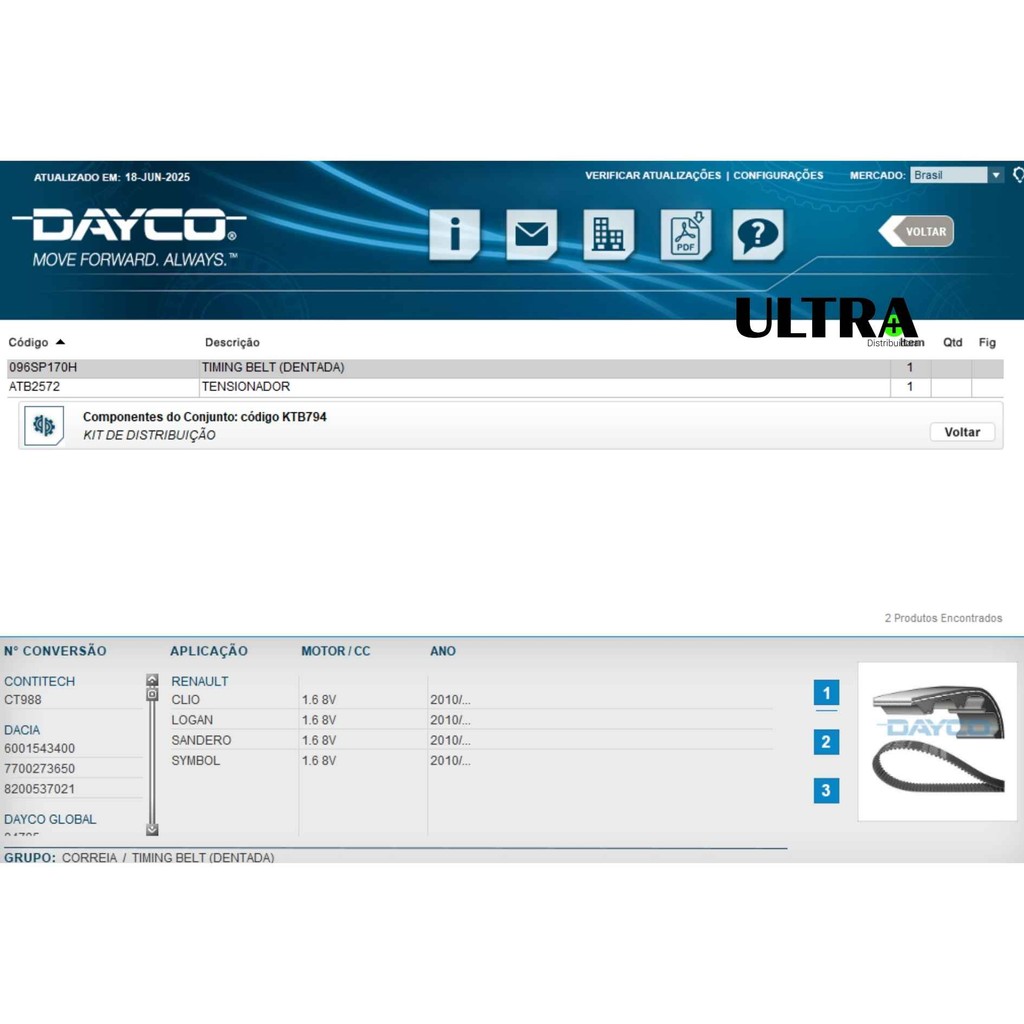 Kit Correia Dentada Tensor para Renault Logan / Sandero / Clio / Symbol - 1.6 8V - K7M (Dayco KTB794) Aplicação compatível: - Compatível com Quantidade de Dentes: 96 Renault K7M MONTADORA: RENAULT VEICULO: LOGAN MOTOR: 1.6 8V ANO DE FABRICAÇÃO: 2010 2011 2012 2013 2014 2015 2016 2017. MODELO: DYNAMIQUE EASY R, EXPRESSION, PRIVILIGE COMBUSTIVEL: GASOLINA, ALCOOL, FLEX. MONTADORA: RENAULT VEICULO: SANDERO MOTOR: 1.6 8V ANO DE FABRICAÇÃO: 2010 2011 2012 2013 2014 2015 2016 2017 2018 2019. MODELO: AUTHENTIQUE, DYNAMIQUE, EXPRESSION, GTLINE, PRIVILIGE, STEPWAY,STEPWAY EASY R RIP CURL,STEPWAY RIP CURL, VIBE. COMBUSTIVEL: GASOLINA, ALCOOL, FLEX. MONTADORA: RENAULT VEICULO: SYMBOL MOTOR: 1.6 8V ANO DE FABRICAÇÃO: 2010 2011. MODELO: CONNECTION, EXPRESSION. COMBUSTIVEL: GASOLINA, ALCOOL, FLEX. O que acompanha - 01 Correia - 01 Tensor Fabricante - Dayco Código Fabricante - KTB794 Códigos Correlativos / Compatíveis: - CT988K3 130C17480R K015662XS KS704 530060410 KDMM9625 KIT-9027 130C13538R 130C17480R Outros diferenciais - Original Dayco - Peças não genuínas / originais da montadora. As informações de linha e códigos originais aqui na Ultra Distribuidora são fornecidas apenas como referência para facilitar e garantir a escolha certa do produto para seu veículo. Códigos originais mencionados apenas como referencial para informar a similaridade com a aplicação da peça com o mesmo.