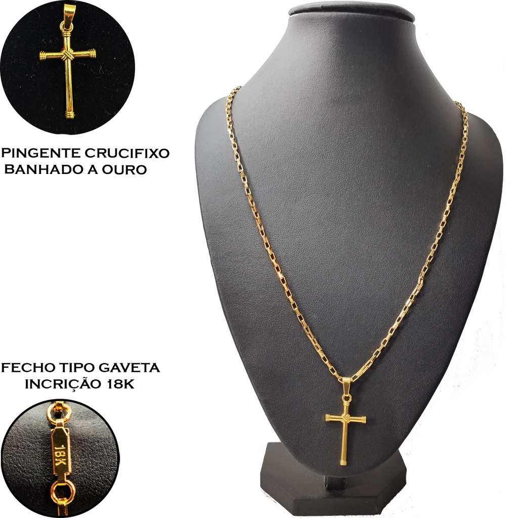 Kit Corrente Banhada 18k Masculina Tijolinho + Crucifixo + Pulseira 60cm