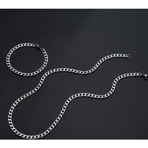 Descrição Conjunto de Corrente e Pulseira Prata Aço Inox Dimensões do Produto: Corrente Comprimento: 60cm Pulseira Comprimento: 20cm Material: Aço Inox 316L Antialérgico Produto a Pronta Entrega O AÇO INOX é mais resistente que a PRATA 925 ou 950.