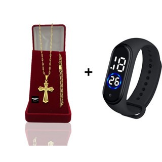 kit Corrente Menino Infantil 2mm Correntinha Banhado a Ouro + Pulseira e Pingente + Relógio Digital Prova Dagua