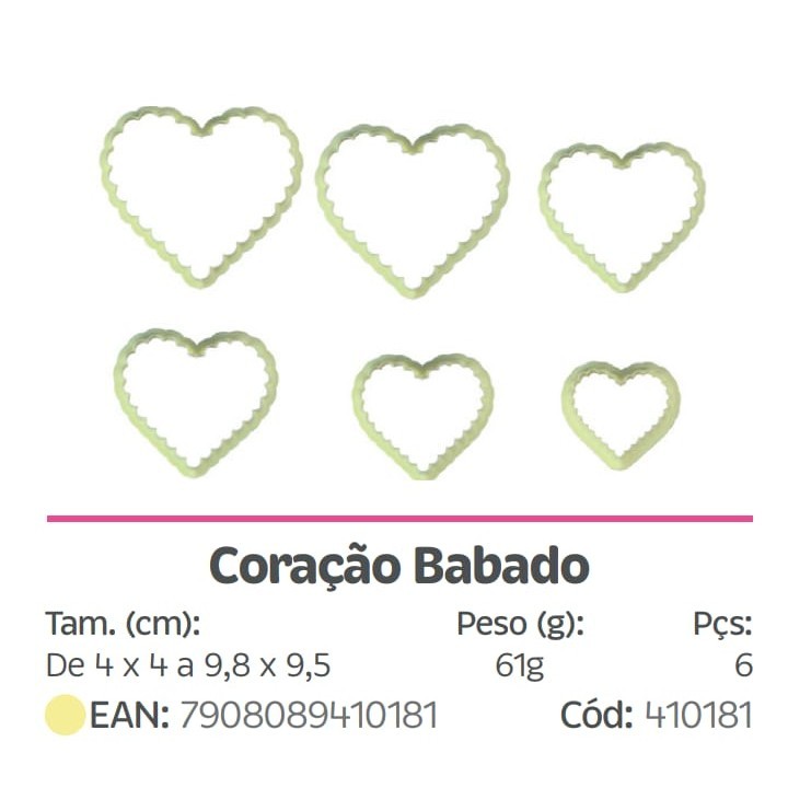 Kit Cortador de Plástico Coração Babado Blue Star com 6 Peças Cada Kit contém 6 peças com tamanhos de 4 a 9,5 cm. Indicado para cortar massa de biscuit, massa de EVA, pasta americana, biscoito e muito mais! Produto: Cortador Finalidade: Cortar massa Tamanho: 4,4 x 9,8 a 8,5 Peso: 61,0 g Quantidade de peças: 06 Material: Poliestireno