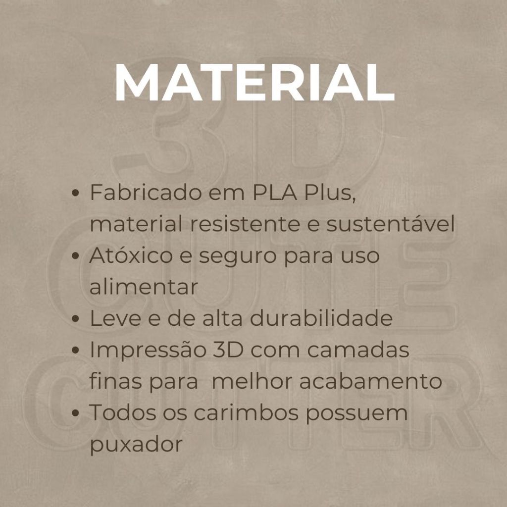- Kit com 1 cortador + 4 carimbos - Todos os carimbos acompanham puxadores - Tamanho na escolha de variações - Cor variável conforme estoque - O tamanho informado sempre se refere à maior largura do cortador - PARA TAMANHOS PERSONALIZADOS ENTRE EM CONTATO VIA CHAT - Espessura de 1 cm - Fabricado em PLA Plus - Material seguro para uso alimentar - Leve, durável e com excelente acabamento - Pode ser usado em biscoitos amanteigado, pasta americana, fondant, chocolate modelável, artesanato (biscuit, argila leve, EVA fino) Este cortador de biscoito 3D é produzido em PLA Plus, um material resistente e seguro para uso alimentar, garantindo durabilidade e precisão nos cortes. Cada peça é impressa com tecnologia 3D de alta qualidade, resultando em detalhes nítidos e acabamento limpo, ideal para confeiteiros que buscam praticidade e beleza nas criações. O cortador é indicado para biscoitos amanteigados, pasta americana, chocolate modelável e também para pequenos trabalhos de artesanato. Para preservar sua qualidade, recomenda-se lavar com água fria ou morna e esponja macia, evitando água quente, lava-louças e exposição a altas temperaturas, pois o PLA Plus pode deformar acima de 50ºC. Leve, prático e funcional, este cortador é perfeito para quem deseja adicionar mais charme e profissionalismo às suas produções.