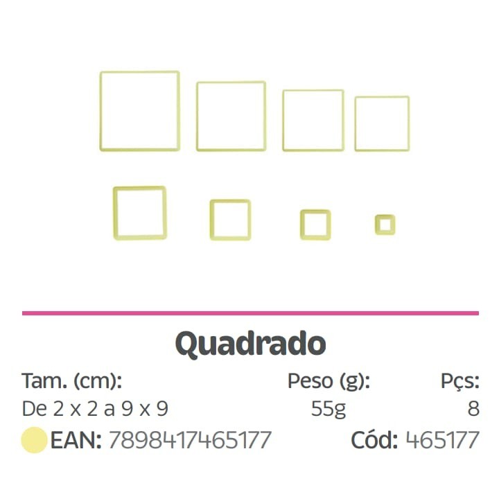 Kit Cortador de Plástico Quadrado Blue Star com 8 peças O cortador Quadrado é utilizado em trabalhos manuais e artesanais..Você poderá marcar, biscuit, pasta americana, porcelana fria, argila, pasta de açúcar, massa de modelar, etc...kit contém 8 peças nos tamanhos:1, 2, 3, 4, 5, 6, 7 e 8 cm.Com 2 cm de espessura cada cortador.