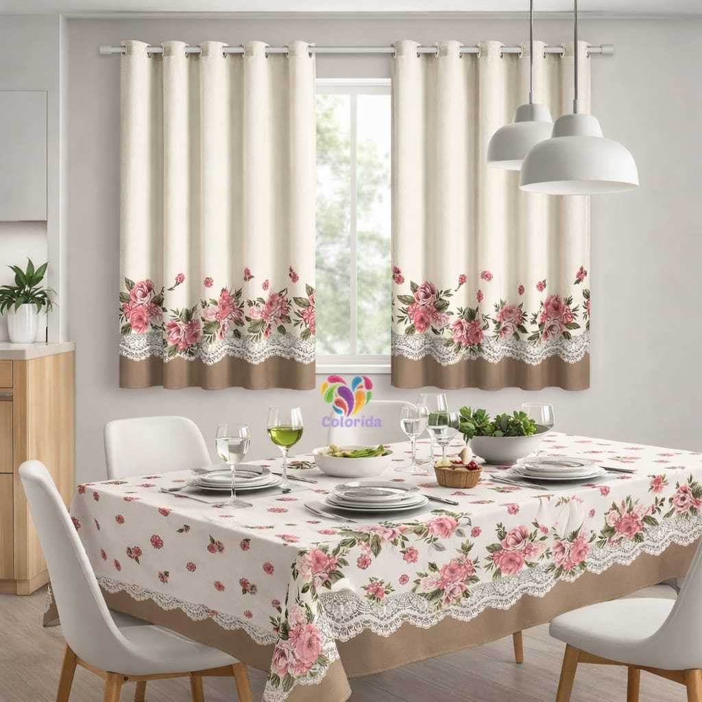 Kit Cortina 2,00 Para Cozinha + Toalha De Mesa Posta 4 e 6 Lugares