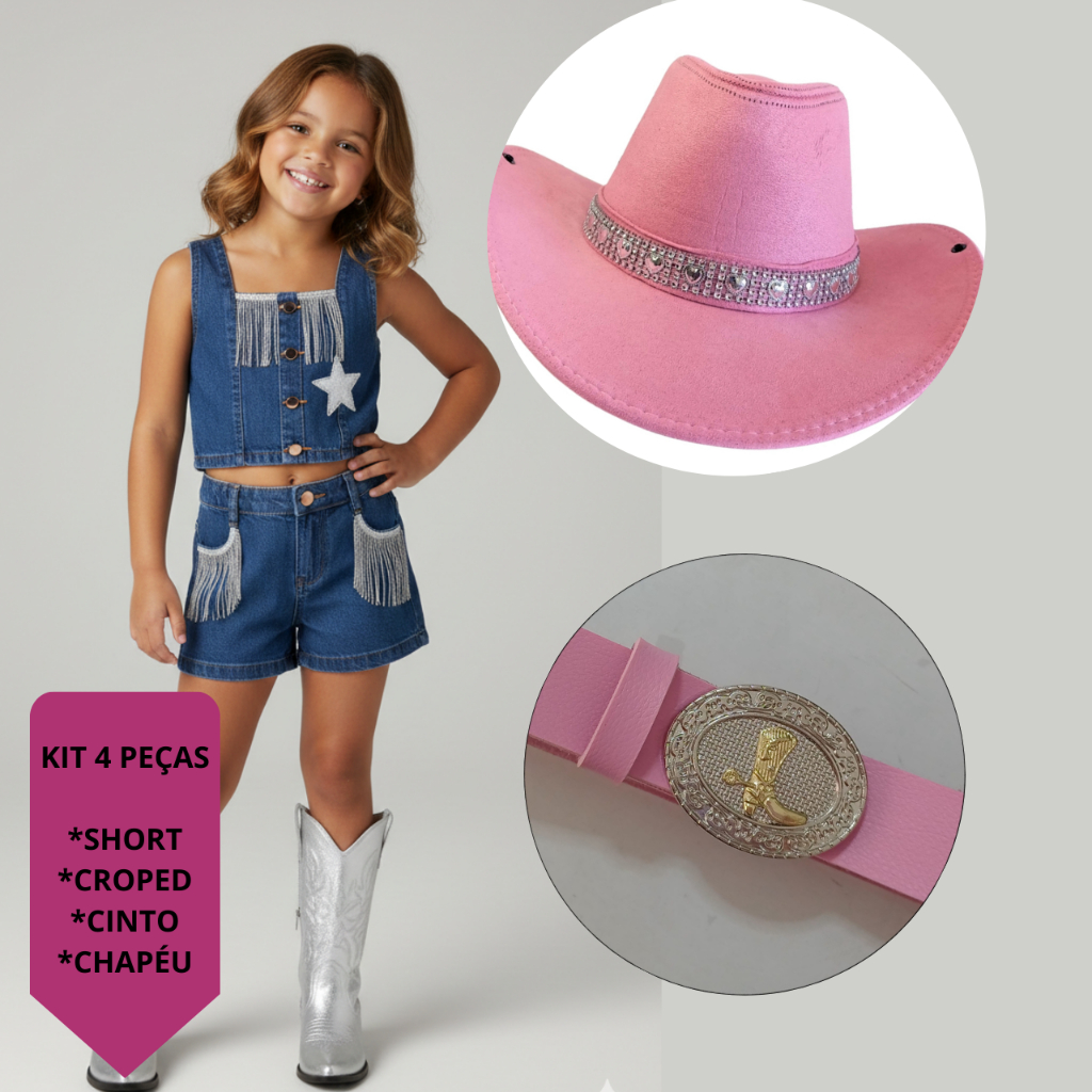 Kit Country Luxo Infantil Menina Cropped Short Franjas Cowboy Boiadeira Com Chapéu Cinto