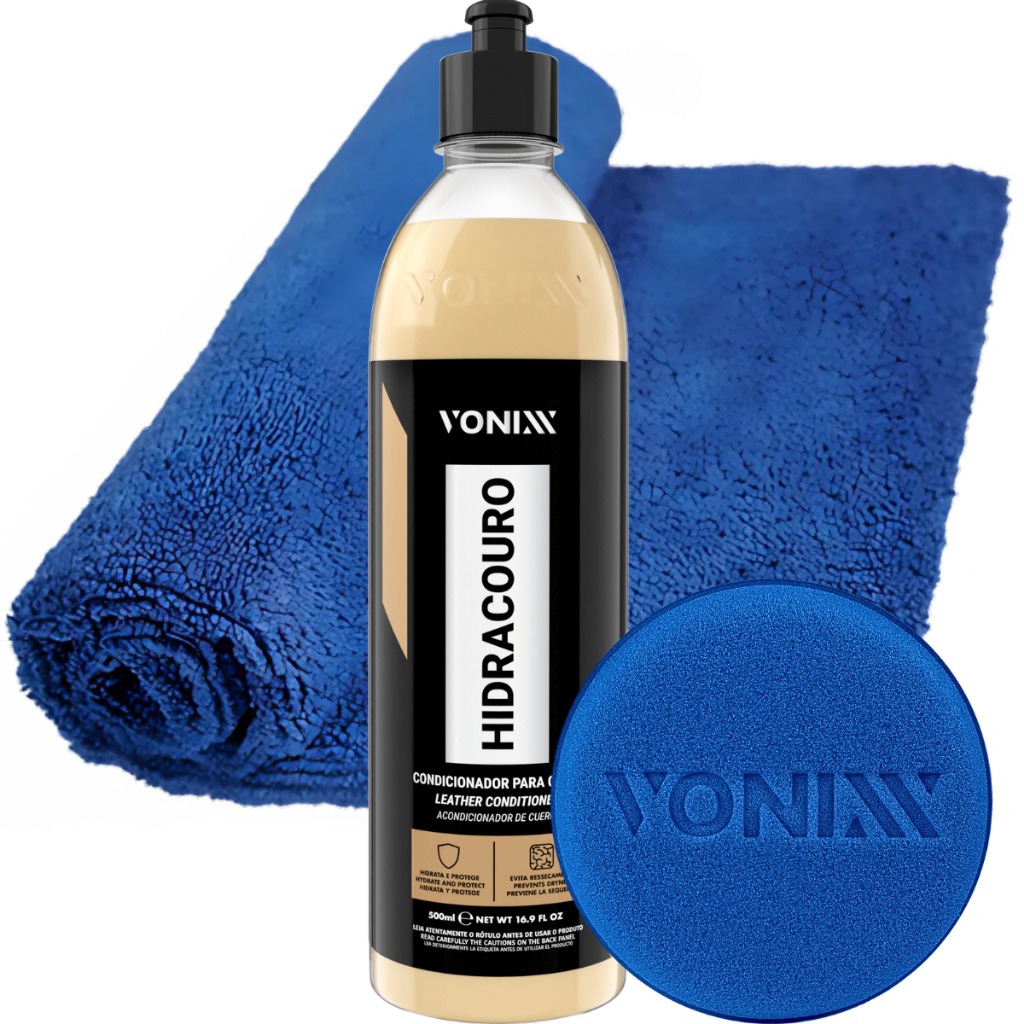 KIT HIDRATAÇÃO DE COURO VONIXX 01 - Hidratante E Condicionador De Couro 500ml - Hidracouro - Vonixx 01 - Pano Vonixx 40x40 S/ Costura 01 - Aplicador De Espuma - Vonixx ---------------------------------------------------------------- CARACTERÍSTICAS HIDRACOURO: - Produto de linha Diamond - Hidrata e protege couros em geral: bancos, sofás, bolsas e etc... - Fórmula avançada à base de matérias-primas nobres - Evita o ressecamento do couro mantendo-o com aspecto de novo - Devolve a maciez, renova e mantém a cor natural do couro APLICAÇÃO HIDRACOURO: - Limpe a superfície com o Higicouro da Vonixx previamente - Aplique o produto com aplicador de espuma até a completa hidratação