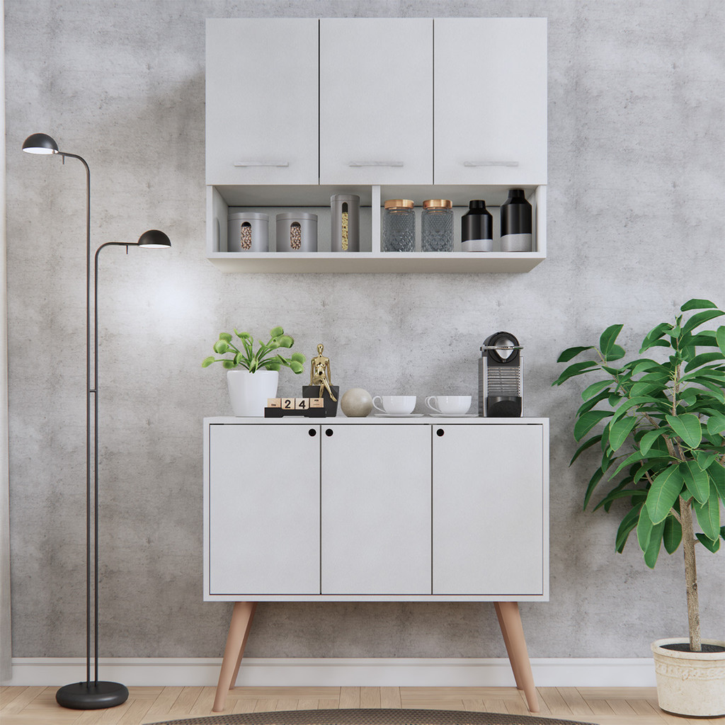 Kit Cozinha Armário 3 Portas + Balcão Multiuso Pés Madeira Organizador Móveis Bonatto