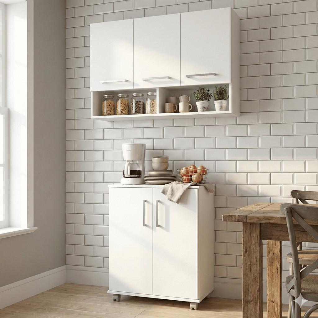 Kit Cozinha Balcão Multiuso com Rodízios + Armário Aéreo Compacto