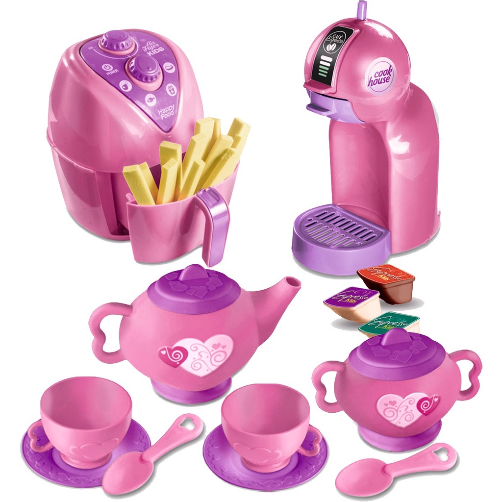 KIT COM 10 BRINQUEDOS 1 AIR FRYER (NÃO ACOMPANHA AS BATATAS) 1 CAFETEIRA 1 BULE COM PIRES, PRATO E TALHER 1 AÇUCAREIRO COM PIRES, PRATO E TALHER