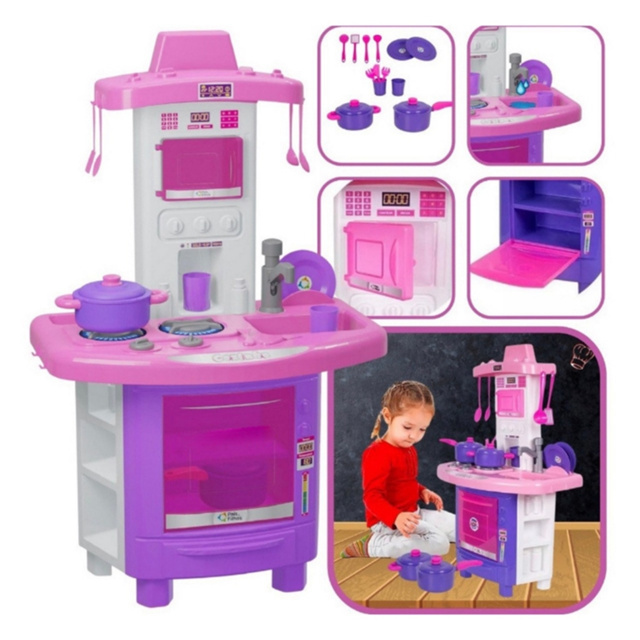 Kit Cozinha Infantil Fogo Brinquedo Agora a casinha dos sonhos vai estar completa com essa cozinha! A nica que sai água de verdade. A Cozinha De Brinquedo Completa traz todos os utensílios básicos de uma cozinha, tudo para deixar a brincadeira o mais real possível. Embalagem Cozinha Infantil De Brinquedo Contém: º 01 Cozinha Infantil; º 02 Panelas; º 02 Copos; º 02 Pratos; º 04 Talheres; º 01 Concha; º 01 Escumadeira; º 01 Colher; º 01 Espátula; º 01 Cartela De Adesivos. Observações : º Pia Que Sai água De Verdade; º Nao Vem Montada; º Grande ( Somente na Cor Rosa ); º Os Botes Do Fogo Fazem Barulho; º Forno e Micro-ondas Abrem As Portas; º Contém 12 Peças. Medidas Kit Cozinha Infantil (Montada): º Altura Cozinha Infantil: 70 Cm; º Comprimento Cozinha Infantil: 27 Cm; º Largura Cozinha Infantil: 43 Cm. Material Cozinha De Brinquedo Infantil: º Papel Carto; º Material Termoplástico; º PVC;
