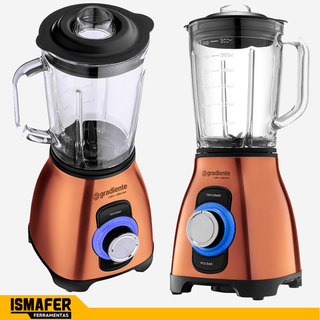 Distribuído por Ismafer Ferramentas LIQUIDIFICADOR GRADIENTE REVOLUTION GLASS 5 VELOCIDADES 2 LITROS COBRE COLLECTION - PGLQ352 + MIXER POWDER 600 3 EM 1 GRADIENTE MIXER, PROCESSADOR E BATEDOR COBRE COLLECTION - PGMX402 127V OU 220V (ESCOLHA A VOLTAGEM) O Liquidificador com Copo de Vidro Revolution Glass Gradiente possui 5 velocidades, função pulsar e triturar. Se você procura beleza e sofisticação para a sua cozinha esse liquidificador é sua melhor escolha. VANTAGENS: - Seu copo em vidro tem capacidade 2 litros - Sua tampa tem encaixe emborrachado que garante vedação total - Seu design de alta qualidade traz acabamento em aço inox escovado prata e cobre, além de 6 lâminas em aço inox super afiadas para preparos dos mais leves aos mais pesados. CARACTERÍSTICAS: - Função Pulse - Copo de vidro - Botão pulse com retorno automático - Aumento Gradual de velocidade para maior controle. FICHA TÉCNICA: - Material: Inox - Potência: 1000W - Trava de segurança - Consumo: 1,00 KW/h - Capacidade: Jarra de 2,00L - Velocidade: 5 Velocidades + Pulsar. Marca: Gradiente Modelo: PGLQ352 Garantia: Até 12 Meses pelo Fabricante. O Mixer Gradiente é completo, versátil e ajuda no preparo de diversas receitas. Tem alta potência e é um produto 3 em 1: Mixer, processador e batedor. Acompanha acessórios além de um copo com capacidade de 700ml. CARACTERÍSTICAS: - Função Batedor: Para bater claras em neve, chantily, gemada, cremes aerados e massas leves. - Função Mixer: Preparar vitaminas, sucos, molhos, maioneses, purê e é ideal para alimentos quentes e frios. - Função Processador: Para triturar e processar alimentos como: Vegetais, temperos, queijos, grãos e carnes. - Função Turbo e Controle de velocidade: Possui controle gradual de velocidade e função turbo com velocidade extra. FICHA TÉCNICA: - Potência: 600W - Níveis de Velocidade: 9 + Função Turbo ACOMPANHA: 01 - Copo de Medidor 01 - Haste Mixer em Inox 01 - Haste tipo Fouet para bater 01 - Triturador Processador com Recipiente. INDICADO PARA: Uso Doméstico, Cozinha. FORMAS DE USO: Misturar, Processar e Bater. Marca: Gradiente Modelo: PGMX402 Garantia: Até 12 Meses pelo Fabricante. SKU: KIT24023_24022 Distribuído por Ismafer Ferramentas