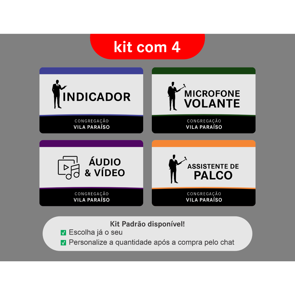 Crachás indicadores para reuniões das Testemunhas de Jeová JW Assim que comprar envie o nome da congregação por mensagem. Caso não envie o nome será enviado sem. Pode escolher a quantidade de cada. Material PVC - Com preção UV Horizontal OBS.: Você pode solicitar alteração das quantidades de cada crachá desde que faça isso assim que comprar por mensagem. OBS.: Não será possível adaptar essa mesma arte para outros eventos