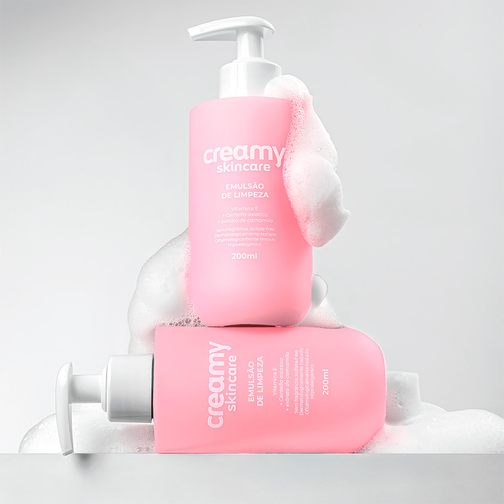 Creamy Skincare Emulsão de Limpeza Glicólico FPS60 Protetor Solar - Limpeza Suave, Renovação Celular e Proteção Avançada Este Kit Contém Creamy Skincare - Emulsão de Limpeza 200ml: promove higienização delicada para peles oleosas, acneicas ou sensíveis, com textura cremosa e ativos calmantes que mantêm a hidratação e a barreira natural da pele. Creamy Watery Lotion FPS 60 - Protetor Solar Facial 50ml: oferece alta proteção contra raios UVA/UVB, luz azul e visível. Fórmula ultraleve, toque seco e resistente à água, ideal para peles oleosas e sensíveis. Creamy Ácido Glicólico - Creme Redutor de Linhas 30g: reduz linhas finas, uniformiza a textura e estimula a renovação celular durante a noite, deixando a pele mais lisa, iluminada e jovem. Conselho de Aplicação Emulsão: aplicar sobre a pele completamente seca, de 1 a 2 vezes ao dia, espalhando até absorção completa. Reaplicar conforme desejado. Protetor Solar Facial: agite antes de usar. Aplique o produto sobre o rosto, pescoço, colo e orelhas de forma abundante. Reaplique sempre após suor intenso, após se molhar ou se secar com toalha. Ácido Glicólico: uso noturno. Aplicar sobre a pele seca e preferencialmente hidratada, evitando a região dos olhos, os cantos do nariz e da boca. Espalhe 1 ou 2 pumps sobre a pele do rosto, pescoço e/ou do colo, se desejar.