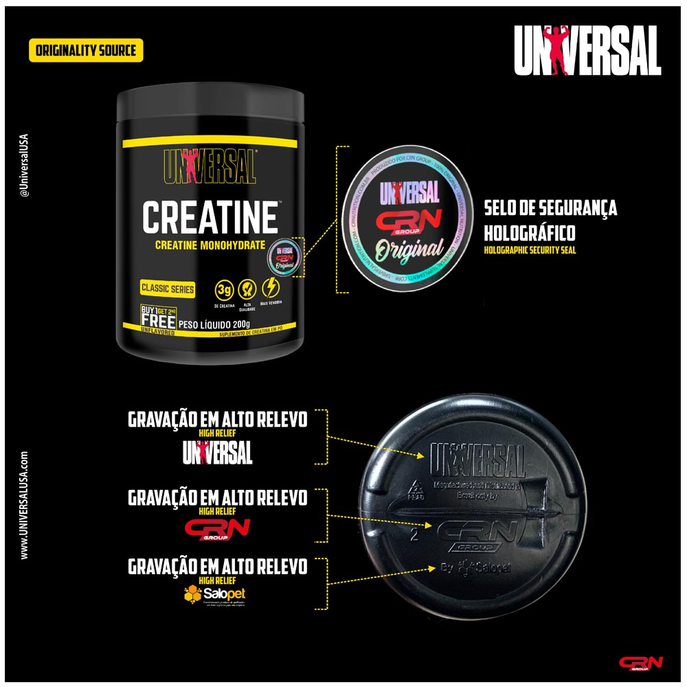 Benefícios - Mais força; - Mais energia: reposição rápida dos níveis de Atp; - Melhor desempenho físico; - Ganho de Massa Muscular; • Aumento na resistência a fadiga • Acelera o processo de recuperação • Aumento no volume muscular • Aumento de força • Melhora a performance nos treinos • Energia muscular • Ganho de massa muscular Destaque •100% Creatina •Sem aditivos artificiais •0 g gorduras •0 g carboidratos •Glúten Free •Pode ser consumidor por vegetarianos e veganos Para que Serve??? A suplementação com Creatina Universal auxilia no aumento dos estoques e no armazenamento da creatina dentro do músculo, o que é fundamental para a produção da energia usada na contração muscular. Quanto maior for a capacidade de contração muscular de uma pessoa, maior será sua capacidade de realizar treinos intensos ou volumosos. Treinos intensos ou volumosos são necessários para quem deseja ganhar força e massa muscular. Assim, Creatina Universal é um suplemento indispensável para quem deseja ganho de força e massa muscular. Como e quando Tomar??? A Creatina Universal pode ser utilizada antes ou após os treinos, assim como em qualquer outro período do dia. O uso da Creatina deve ser feito preferencialmente com carboidratos de alto índice glicêmico, para aumentar a retenção da creatina dentro do músculo. A suplementação de creatina tem como base o efeito crônico, ou seja, é necessário usar a creatina em dias consecutivos, independente ou não de ter treinado naquele dia. É importante frisar que não existe relação do uso de creatina com a retenção hídrica, pois a creatina tem efeito dentro do músculo, e não fora, como se acreditava antigamente. SUGESTÃO DE CONSUMO Diluir a porção de 3 g (1 dosador), em bebida de sua preferência e consumir uma vez ao dia, ou conforme orientação profissional. INGREDIENTES: Creatina Monoidratada em pó. NÃO CONTÉM GLÚTEN. RECOMENDAÇÕES: Conservar este produto ao abrigo de luz, calor e umidade. ANVISA: Registro ISENTO conforme resolução RDC 27 de 06 de agosto de 2010 anexo I.