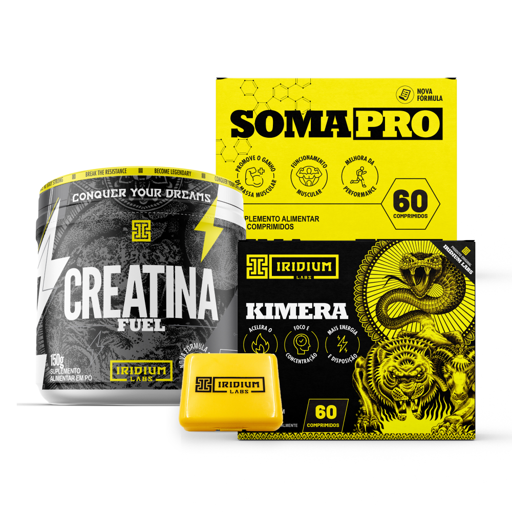 Creatina Monohidratada Fuel 150g - Iridium Labs Tenha mais energia nos treinos de força e potencialize seus ganhos de hipertrofia muscular. Aumente sua força e volume muscular sem prejudicar seu bolso! A Creatina Fuel chegou para mostrar que é possível obter todos os benefícios da suplementação de uma creatina de qualidade sem gastar rios de dinheiro. Isso porque, sua fórmula contém maltodextrina em uma pequena quantidade, são apenas 2,8 de carboidratos por porção para 3g de creatina. E se você acha que consumindo essa quantidade terá prejuízo na dieta você está enganado. Veja só, 2,8g de carboidrato é o equivalente a 100g de alface que você consumiria no almoço e no jantar. Por isso não se assuste em pensar que consumindo essa quantidade de malto estará arruinando sua dieta. A creatina é um suplemento natural usado para aumentar o desempenho atlético. Não é apenas seguro, mas também um dos suplementos mais populares e eficazes do mundo. É um dos principais combustíveis energéticos para as células musculares produzirem energia em exercícios curtos de alta intensidade. Além disso, a creatina é um suplemento popular e eficaz no aumento da massa muscular. Ela é capaz de alterar inúmeras vias celulares que levam ao crescimento dos músculos. Por exemplo, aumenta a formação de proteínas que criam novas fibras musculares. Também pode aumentar os níveis de fator de crescimento semelhante à insulina 1 (IGF-1), um hormônio que promove aumento na massa muscular. E não é só isso, hoje a creatina vem sendo estudada e empregada para fins medicinais como no tratamento de doenças neurodegenerativas. Dessa forma, a creatina é um suplemento eficaz com benefícios poderosos para o desempenho atlético e para a saúde ! Kimera Thermo - Iridium Labs Esse tipo de suplemento pode ser usado para prevenir deficiências alimentares causadas por alguma patologia ou circunstância específica, além de colaborar com a saúde e o bem-estar geral. É importante destacar que seu uso deve ser acompanhado por uma dieta equilibrada e hábitos de vida saudáveis. A cafeína auxilia no aumento da capacidade de resistência e no desempenho de exercícios físicos de resistência. Recomendado para a atividade aeróbica A cafeína é um suplemento usado por muitas pessoas que praticam esportes, pois tem muitos benefícios: ajuda a reduzir a sensação de cansaço e a fadiga em exercícios prolongados, permite fazer exercícios mais longos e estimula o sistema nervoso central. Tudo isto o torna o suplemento ideal para atividades aeróbicas. A cafeína auxilia no aumento do estado de alerta e na melhora da concentração. A cafeína auxilia no aumento da capacidade de resistência e no desempenho de exercícios físicos de resistência. *Este produto é um suplemento dietético, não é um medicamento. Suplementa Ante dietas insuficientes. Consulte seu médico e / ou farmacêutico. ""Este produto não deve ser consumido por gestantes, lactantes e crianças"" Ingredientes: Cafeína, aromatizantes naturais (extratos secos de Citrus aurantium, Chá verde e Gengibre), antiumectantes (Carbonato de cálcio e Dióxido de silício), veículo Maltodextrina, estabilizante Croscarmelose, lubrificante Estearato de magnésio, emulsificante Hidroxipropilmetilcelulose, corantes artificiais (dióxido de titânio e amarelo tartrazina) e espessante Talco, veículo polietilenoglicol. NÃO CONTÉM GLÚTEN. ALÉRGICOS: PODE CONTER DERIVADOS DE SOJA. Informações Técnicas: Apresentação: comprimidos Cada caixa contém 60 comprimidos Duração de cada caixa: 30 dias Não contém glúten Soma Pro ZMA Pré Hormonal - 60 comps Iridium Labs ZMA, ou aspartato de zinco e magnésio, é um suplemento popular. Ele contém uma combinação de três ingredientes principais - zinco, magnésio, vitamina B6 e, no caso do SomaPro além desses três nutrientes fundamentais contém também Selênio.A deficiência de qualquer um desses minerais pode trazer prejuizos a saúde. * ESTE PRODUTO NÃO É UM MEDICAMENTO *Este produto é um suplemento dietético, não é um medicamento. Suplementa Ante dietas insuficientes. Consulte seu médico e / ou farmacêutico Ingredientes: Óxido de Magnésio, Carbonato de Cálcio, Óxido de Zinco, Piridoxina HCL, Nicotinamida, Selenito de Sódio, Agente de massa: Celulose Microcristalina; Estabilizante; Croscamerlose Sódica; Antiumectante: Dióxido de Slício: Lubrificante: Esteorato de Magnésio: Espessantes: Copolímero Enxertado de Álcool Polivinilico. Talco, Polietilenoglicol; Corante: Óxido de Ferro Preto INS172i. Porta Cápsulas - Iridium Labs Dimensões: Altura: 1,5cm Largura: 7cm Profundidade: 5,5cm Peso: 14g