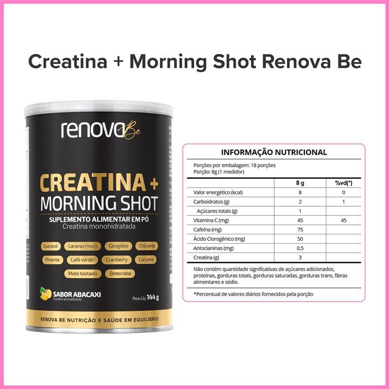 Creatina Monohidratada + Morning Shot – Renova Be A Creatina Morning Shot Renova Be foi desenvolvida para apoiar a produção de energia e a disposição no dia a dia, sendo ideal para quem busca mais foco, rendimento e vitalidade, mesmo fora da rotina de treinos. Variações de sabores • Laranja • Abacaxi • Limão com Morango Selecione o sabor desejado no momento da compra. Principais características • Auxilia na produção de energia corporal • Contribui para foco e disposição • Apoia o metabolismo • Pode ser utilizada diariamente • Sabores leves e agradáveis Modo de consumo • Misturar 1 scoop (8 g) em 150 ml de água fria • Consumir 1 vez ao dia Horário sugerido • Preferencialmente pela manhã ou antes da atividade física Para quem é indicado • Produto indicado para adultos acima de 19 anos que buscam mais energia e desempenho no dia a dia. Contraindicações • Não indicado para menores de 19 anos • Gestantes e lactantes devem consultar um médico antes do consumo de suplementos • A Renova Be possui uma linha exclusiva para gestantes e lactantes Diferencial Renova Be • Fórmula prática para o dia a dia • Suplemento versátil, inclusive fora da rotina de treinos • Produto desenvolvido com foco em bem-estar, energia e performa Sérum Facial Cinderela Lifting Rápido Anti-Rugas Renova Be O cuidado que valoriza sua beleza natural em minutos. O Sérum Facial Cinderela Renova Be foi desenvolvido para mulheres que desejam uma pele visivelmente mais firme, lisa e iluminada, sem procedimentos invasivos. Com efeito lifting imediato, ele transforma a aparência da pele logo nas primeiras aplicações, promovendo sensação de frescor, descanso e rejuvenescimento. - Destaques do Produto Efeito lifting rápido e perceptível, que suaviza rugas e linhas de expressão. Ação imediata que melhora a firmeza e a elasticidade da pele. Textura leve, confortável e de absorção rápida, sem pesar ou deixar oleosa. Pele com aspecto mais jovem, uniforme e radiante em poucos minutos. Ideal para quem busca resultados rápidos no dia a dia. - Benefícios do Sérum Cinderela Renova Be Auxilia na redução visível de rugas e marcas de expressão. Proporciona sensação de pele firme, descansada e revitalizada. Realça a luminosidade natural da pele. Contribui para a hidratação e vitalidade cutânea. Pode ser usado antes da maquiagem, ajudando a deixar o acabamento mais bonito e uniforme. - Diferenciais Renova Be Tecnologia com efeito tensor imediato para um lifting natural. Fórmula dermatologicamente testada, indicada para todos os tipos de pele. Resultados visíveis sem agulhas, cirurgias ou procedimentos invasivos. Embalagem prática, elegante e ideal para o uso diário. - Modo de Uso Limpe e tonifique o rosto, removendo resíduos de sujeira ou oleosidade. Aplique uma pequena quantidade do produto (equivalente a meio grão de arroz) sob a pálpebra inferior e nas linhas de expressão que deseja suavizar. Espalhe delicadamente com leves batidinhas, sem esfregar. Aguarde 90 segundos sem realizar expressões faciais (passo essencial). Após atingir o efeito desejado, espere a absorção completa e finalize com maquiagem ou protetor solar. - Composição: Água, silicato de sódio, silicato de magnésio e alumínio, acetil hexapeptídeo-8. - Precauções Uso externo. Manter fora do alcance de crianças. Em caso de ingestão, procurar auxílio médico. Conservar em local seco e protegido do calor excessivo. Se ocorrer irritação ou coceira, suspender o uso imediatamente. Não aplicar sobre a pele irritada ou lesionada. Utilizar apenas nas áreas indicadas. - Cuidados de Conservação Manter a embalagem bem fechada. Proteger do ar, umidade, luz e calor excessivo. Conservar em temperatura ambiente entre 15°C e 32°C. Lote e validade: vide embalagem.