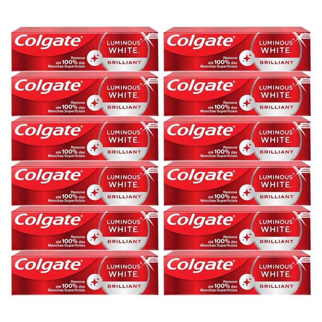 Kit Creme Dental Colgate Luminous White Brilliant 70g com 12 unidades Colgate Luminous White é um creme dental branqueador que contém aceleradores de clareamento que resultam em um tom mais branco em 1 semana. Modo de usar: Escove os dentes adequadamente após cada refeição, três vezes ao dia durante dois minutos. Enxágue completamente depois da escovação. Exclusivos micro cristais aceleradores de branqueamento Remove manchas com segurança e previne a formação de tártaro Sorriso 1 tom mais branco em uma semana