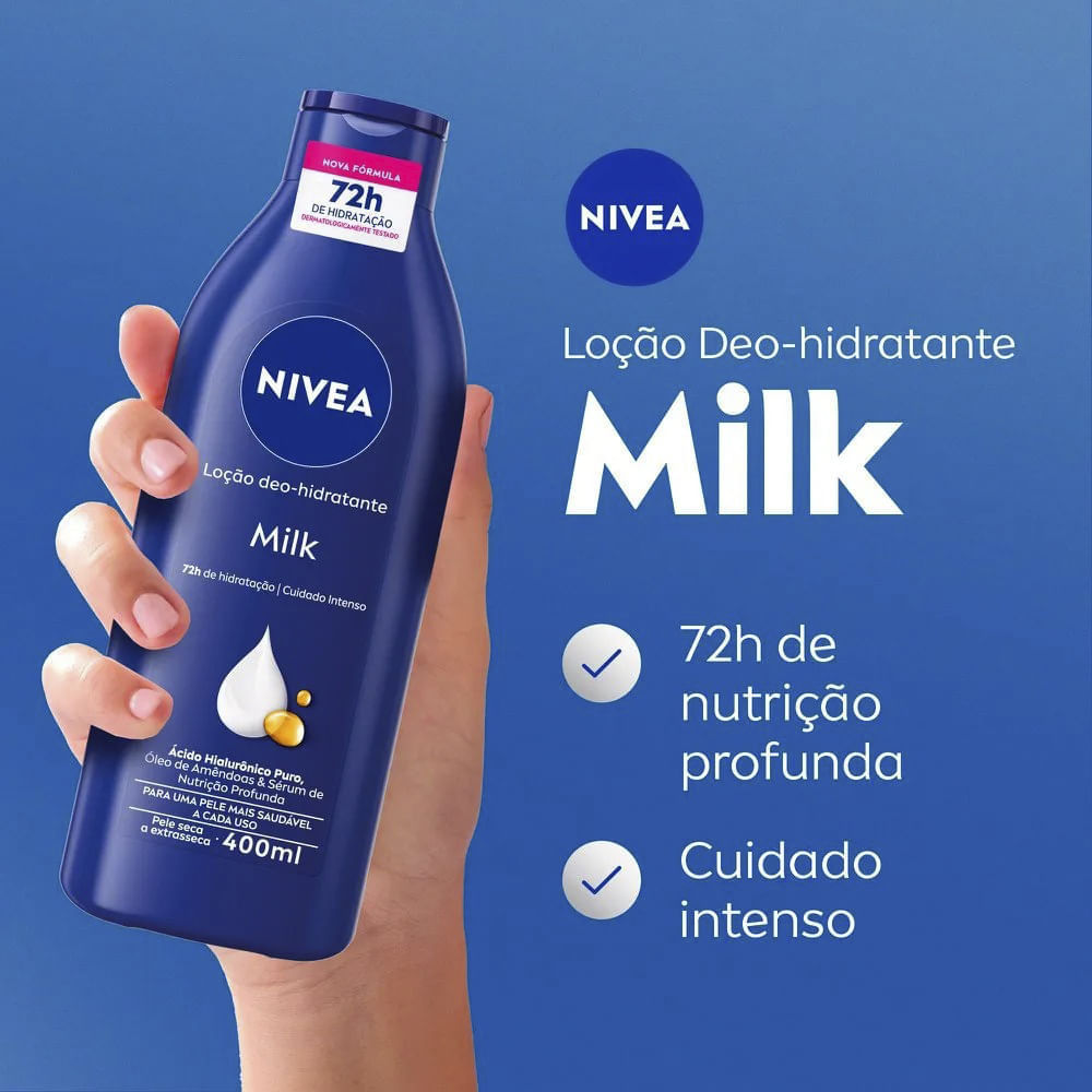 O Creme Hidratante Corporal Nívea Milk Pele Seca A Extrasseca 400ml é um produto desenvolvido para hidratar profundamente a pele, proporcionando um cuidado intensivo. Sua textura cremosa e suave oferece uma agradável sensação de maciez, cuidando e protegendo a pele do ressecamento. NIVEA Loção Hidratante Milk Pele Seca a Extrasseca possui uma fórmula enriquecida com duas vezes mais óleo de amêndoas, nutre intensamente por até 48 horas. Indicado especialmente para peles secas e extrassecas, este hidratante corporal é livre de corantes, sem álcool etílico e não contém ingredientes de origem animal. Denso e com a clássica fragrância de NIVEA, deixa a pele visivelmente mais saudável e bonita. Contém no kit: • 2 Creme Hidratante Corporal Nívea Body Extra Seca 400ml Benefícios: • 2x mais óleo de amêndoas; • 48 horas de hidratação profunda; • 0% corantes e álcool etílico; • Livre de ingredientes de origem animal; • Contém vitamina E. Modo de usar: • Aplique sobre a pele. • Use o produto diariamente para garantir uma maciez prolongada. Sobre a marca: Nivea é uma marca global de produtos cosméticos para a pele e higiene corporal. A empresa foi fundada em 28 de março de 1882 pelo farmacêutico Paul Carl Beiersdorf. Em 1900, o novo proprietário Oscar Troplowitz, o químico Isaac Lifschütz e o dermatologista Paul Gerson Unna inventaram o primeiro creme hidratante da história, em 1911. Eles desenvolveram uma emulsão de água em óleo, como um creme para a pele com Eucerit, a primeira emulsão estável desse tipo. Esta foi a base para o Eucerin e, posteriormente, para a Nivea, uma das marcas de cuidado com a pele mais confiáveis no mundo inteiro.