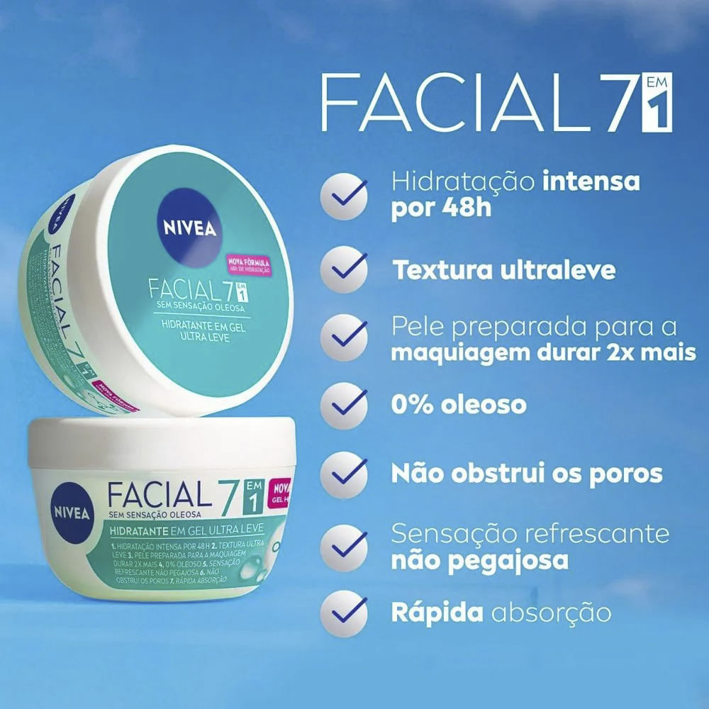 O NIVEA Hidratante Facial 7 em 1 é um gel ultraleve desenvolvido especialmente para peles oleosas e mistas. Com fórmula inovadora enriquecida com gel hialurônico, proporciona hidratação intensa por até 48 horas sem deixar sensação oleosa. Sua textura leve é rapidamente absorvida e ajuda a preparar a pele para uma maquiagem com duração prolongada. Benefícios: • Hidrata intensamente por até 48 horas. • Textura ultraleve e refrescante. • Prepara a pele para a maquiagem durar 2x mais. • Controle do brilho sem obstruir os poros. • Sensação não pegajosa. • Absorção rápida. • Adequado para peles oleosas e mistas. Modo de uso: • Aplicar o hidratante sobre o rosto limpo e seco, massageando suavemente até completa absorção. • Pode ser usado diariamente, pela manhã e à noite. Precauções: • Evitar contato com os olhos. Em caso de irritação, suspender o uso e procurar orientação médica. • Manter fora do alcance de crianças. Sobre a marca: Marca nº 1 de cuidados com a pele no mundo, seu pioneirismo e sucesso fazem da NIVEA uma marca que sempre dita tendências de inovação. O cuidado com as pessoas, há mais de 100 anos, e a segurança do consumidor são as nossas prioridades. A NIVEA conta com mais de 500 itens em seu portfólio que valorizam a individualidade e necessidades de cada tipo de pele. • Garanta já o seu NIVEA Hidratante Facial 7 em 1 e mantenha sua pele hidratada, leve e pronta para arrasar todos os dias.