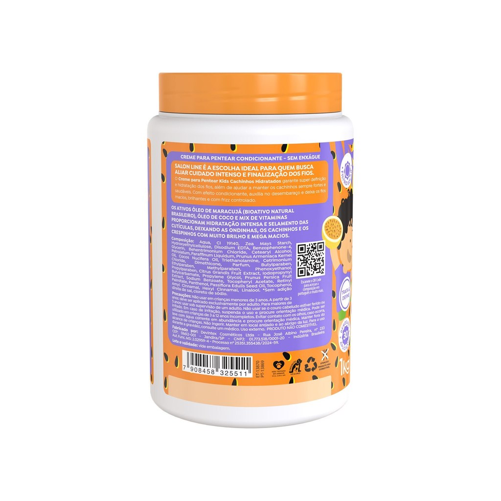 O kit conta com um Creme para Pentear Cachinhos Poderosos e Creme para Pentear Cachinhos Hidratados. Juntos são especialmente formulados para cuidar dos fios delicados, oferecendo hidratação, definição e controle do frizz. <>INDICAÇÕES$& Para quais tipos de cabelo? Cabelos ondulados, cacheados e crespos. Qual a indicação? Cabelos finos, brilho, definição e redução de frizz. Pode usar a partir de quantos anos? A partir de 3 anos. <>ATIVOS$& Quais os principais ativos? Creme para Pentear Morango Óleo de coco: poderoso ativo hidratante para os cabelos que proporciona maciez e suavidade aos cachinhos das crianças. Óleo de macadâmia: promove brilho e hidratação dos cachinhos. Óleo de semente de melancia: auxilia na nutrição e maciez dos fios. Extrato de frutas vermelhas: possui propriedades emolientes e nutritivas para os cabelos. Creme para pentear Maracujá Sua fórmula conta com os ativos óleo de maracujá (bioativo natural brasileiro), óleo de coco e mix de vitaminas que, juntos, proporcionam hidratação intensa e selamento das cutículas, deixando as ondinhas, os cachinhos e os crespinhos com muito brilho e mega macios. <>MODO DE USO$& Qual a melhor forma de usar? Creme para pentear Kids Cachinhos Hidratados Maracujá e Creme para pentear Kids Cachinhos sem nós Todos os itens Para obter um resultado impecável, sugerimos finalizar sempre com os cabelinhos molhados, fazendo a divisão em mechas para uma aplicação uniforme. Desembarace os fios com um pente de dentes largos e em seguida, amasse-os iniciando o movimento das pontas até a raiz. <>CARACTERÍSTICAS$& É produto vegano? Todos os produtos do kit são veganos. É liberado? Nenhum item é liberado.
