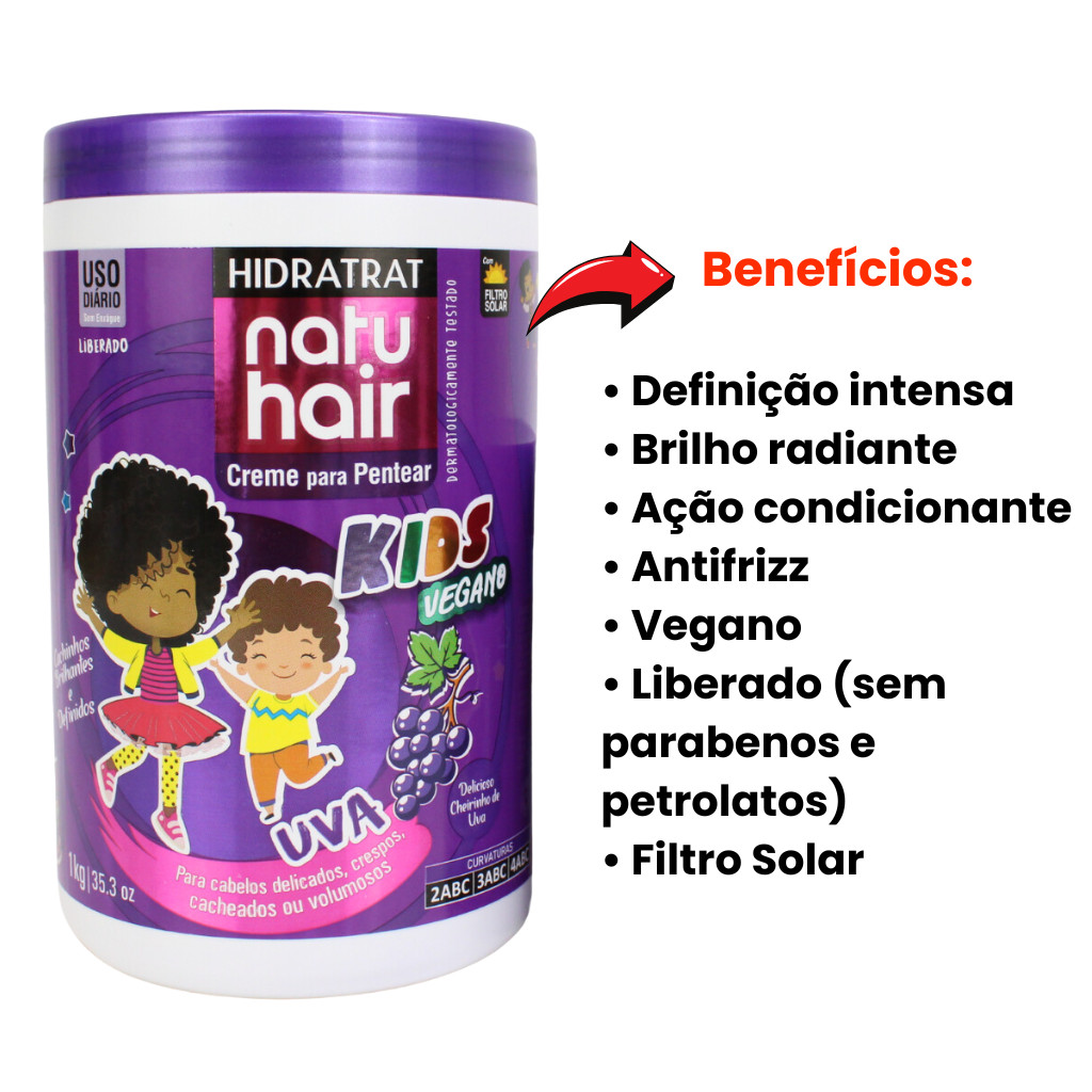Kit Creme de Pentear Uva 1Kg + Gelatina de Uva Kids Vegano Natuhair 1kg Pode usar a partir de quantos anos? 3 anos. Este é o Kit ideal para ativar os cachos e crespos da criançada deixando os fios modelados e fixados por mais tempo O Creme para Pentear NatuHair Kids UVA chegou para transformar a rotina de cuidados dos pequenos! Perfeito para cabelos delicados, cacheados e crespos, ele é o aliado ideal para manter os fios saudáveis e bonitos todos os dias. Com uma fórmula suave e segura, o NatuHair Kids UVA é ideal para o cuidado diário, protegendo e embelezando os cachinhos Ele possui uma fórmula enriquecida com Óleo de Coco e Manteiga de Karité que proporcionam hidratação intensa e definição aos cachinhos. Com ação antifrizz, é ideal para a rotina capilar das crianças, deixando os cabelos com um cheirinho delicioso de Melancia, macios e cachinhos impecavelmente definidos.