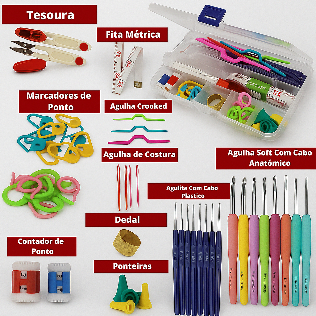 Kit Crochê Completo 53 Peças Para Amigurumi - Agulhas com Cabo Soft +Tesoura +Acessórios, Prático de Usar