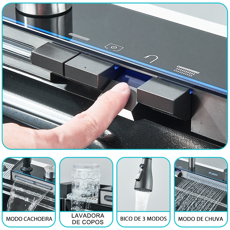 Se você precisar de água quente, por favor use aquecedor elétrico, gás ou sistema de aquecimento solar. A função LED do modelo A é energia hídrica, vamos enviar o motor hidroeléctrico junto com a pia, NÃO NECESSAR de enchufe. Nota: Temos tamanho diferente e funções diferentes: Cinzento A: 75*46*21cm, COM luz LED e exibição de temperatura Ouro Fosco A: 75*46*21cm, COM luz LED e exibição de temperatura Cinzento E: 75*46*21cm, SEM luz LED + SEM exibição de temperatura Prata Fosco E: 75 * 46 * 21cm, SEM luz LED + SEM exibição de temperatura Cinzento C: 60*45*21cm, SEM luz LED + SEM exibição de temperatura, Cinzento D: 60 * 45 * 21cm, SEM luz LED + SEM exibição de temperatura Veja a diferença específica de cada foto do produto. 💕🎉 Caros clientes queridos, bem-vindos à nossa loja, desejo que você tenha uma melhor experiência de compra em nossa loja! 💕 1. Todos serão enviados do armazém São Paulo. 2. se você tiver alguma dúvida ou recebeu mercadorias de má qualidade, entre em contato com o atendimento ao cliente, forneceremos soluções. Descrição do produto: Material Predominante: Aço inoxidável Espessura: 1,2 mm Acabamento: Tecnologia Nano Aplicação de aplicação: Embutido ou Superimposo Perfuração da válvula da válvula: 4,1/2" Acompanha Acessórios: Sim Sifão Sifão: Sim Dimensões Aproximadas: Medidas externas: 75x46x21 cm Medidas internas de tigela grande: 70x 36,3x 20 cm Medidas da Caixa: 81 x 49 x 26 cm