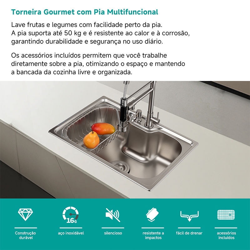 Kit Cuba Gourmet Cozinha 60x42cm E Torneira de água quente e fria na cozinha prata