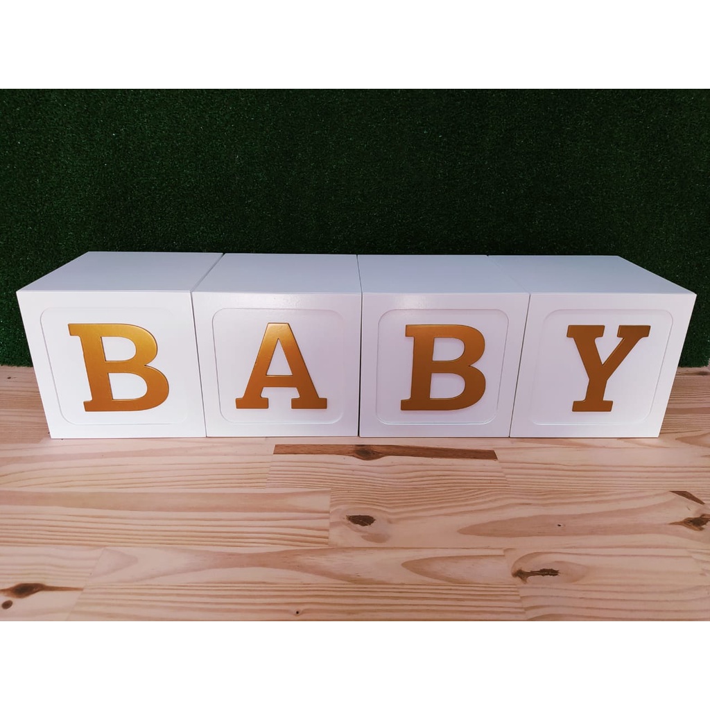 QUATRO POTE CUBO DECORATIVO BABY BRANCO E DOURADO CUBOS DECORATIVOS FORMANDO A PALAVRA "BABY", PINTURA BRILHANTE. PODE SER USADO COM DECORAÇÃO DE QUARTO INFANTIL OU EM FESTA, PARA DECORAÇÃO DE MESA. CUBO TOTALMENTE FEITO EM MDF COM ABAS E LETRAS RECORTADAS EM MDF TAMBÉM MEDIDAS: 30x30x30 CM (CADA CUBO) CUIDADOS: É IMPORTANTE MANTER SEMPRE AS PEÇAS DENTRO DO SAQUINHO QUANDO NÃO ESTIVEREM USANDO, OU QUANDO FOR GUARDA-LAS. PROCURE EVITAR, PRINCIPALMENTE NAS PRIMEIRAS SEMANAS, DEIXAR UMA ENCOSTADA A OUTRA PARA QUE NÃO CORRA RISCO DE ARRANHÕES INDESEJÁVEIS. PARA LIMPEZA USE PANO SECO, OU EM CASOS EXTREMOS, UM PANO LEVEMENTE UMEDECIDO.