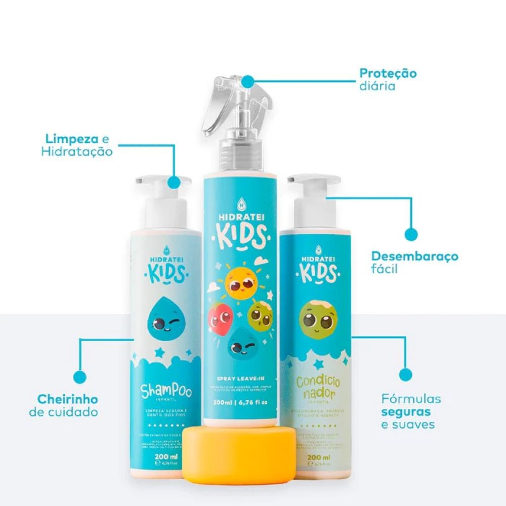 O Kit Hidratei Kids oferece uma rotina completa de cuidados capilares, com shampoo, condicionador e spray, garantindo cabelos limpos, macios e cheirosos. Vegano, hipoalergênico e dermatologicamentetestado, o Kit Hidratei Kids é a soluçãocompleta para os pais que desejam oferecer o melhor cuidado capilar para seus filhos. O Kit contém: Shampoo Kids Condicionador Kids Spray Kids Modo De Usar: Shampoo: Aplique no cabelo úmido, massageie o couro cabeludo e espalhe a espuma por todo o comprimento. Enxágue bem e repita se necessário. Condicionador: Com os cabelos limpos e úmidos, aplique o condicionador no comprimento dos fios. Massageie suavemente e enxágue bem. Spray Kids: Borrife no comprimento e pontas após o shampoo e antes do condicionador ou máscara, massageie e enxágue
