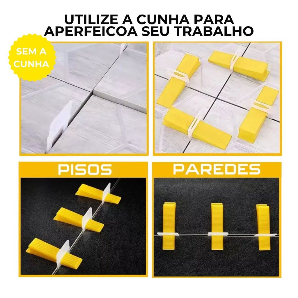 ENVIO RÁPIDO E IMEDIATO! Contém: 100X PÇS de Cunha Niveladora Bonas Utilizadas principalmente na construção e na indústria de azulejos e cerâmica para garantir que as superfícies estejam niveladas e uniformes durante a instalação de pisos, azulejos ou outras estruturas. Evite desníveis e irregularidades, resultando em um acabamento mais profissional e esteticamente agradável. Reduza o tempo necessário para nivelar e alinhar as peças, tornando o trabalho mais eficiente e preciso. Ajudam a manter um espaçamento uniforme e nivelado entre as peças, evitando desníveis e garantindo um resultado final impecável. As cunhas niveladoras são fabricadas com plásticos resistentes e duráveis, proporcionando uma longa vida útil e desempenho confiável. O sistema de encaixe das cunhas é simples e intuitivo, permitindo uma instalação rápida e prática, mesmo para usuários iniciantes. MEDIDAS Altura: 2cm Comprimento: 14cm Largura: 8cm INFORMAÇÕES TÉCNICAS - Amarelas; - A cunha pode ser reutilizada, apenas certifique-se que esta em perfeitas condições; - Utilize com espaçador de 1 mm ou 1,5 mm. Para juntas maiores, utilizar espaçadores tradicionais até 10 mm; - Utilizar os espaçadores/niveladores de acordo com o espaçamento desejado. Invista na qualidade e precisão do Kit com 100 Cunhas Niveladoras da marca Bonas. Tenha em mãos as ferramentas ideais para um acabamento impecável em seus projetos.