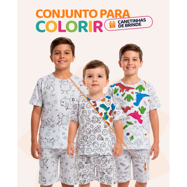 Após a brincadeira, basta lavar normalmente — as cores saem com facilidade — e o pijama fica pronto para ser pintado novamente! Cada conjunto vem com camiseta e bermuda estampadas com desenhos divertidos, prontas para serem coloridas com as canetinhas laváveis que acompanham o produto. Escolha entre 3 opções de Kits: - Kit 3 Conjuntos de Colorir - Kit 2 Conjuntos de Colorir - 1 Conjunto de Colorir Cada conjunto acompanha: - 1 Camiseta + 1 Bermuda - 1 kit de canetinhas laváveis de brinde Detalhes do Produto Camiseta: 100% algodão – toque natural, macio e respirável Bermuda: 85% algodão + 15% poliéster – leve, resistente e confortável Canetinhas laváveis – saem facilmente com água e sabão Modelagem confortável e soltinha Ideal para o verão e dias mais quentes Pode ser lavado e reutilizado quantas vezes quiser Tabela de Medidas – Pijama Infantil para Colorir Camisa Tam 2 – Tórax 30 cm | Comprimento 40 cm Tam 3 – Tórax 32 cm | Comprimento 43 cm Tam 4 – Tórax 34 cm | Comprimento 45 cm Tam 6 – Tórax 35 cm | Comprimento 47 cm Tam 8 – Tórax 37 cm | Comprimento 51 cm Tam 10 – Tórax 39 cm | Comprimento 54 cm Bermuda Tam 2 – Cintura 19 cm | Comprimento 28 cm Tam 3 – Cintura 20 cm | Comprimento 29 cm Tam 4 – Cintura 20 cm | Comprimento 29 cm Tam 6 – Cintura 22 cm | Comprimento 33 cm Tam 8 – Cintura 22 cm | Comprimento 35 cm Tam 10 – Cintura 25 cm | Comprimento 40 cm Pode haver pequena variação (±2 cm) conforme o processo de confecção. Benefícios do Kit -Estimula a criatividade e coordenação das crianças -Pode ser colorido e lavado quantas vezes quiser -Tecido leve, macio e respirável -Ideal para o verão ou para dormir confortavelmente Dica Adicione mais de um kit ao carrinho e aproveite o mesmo frete para montar uma coleção completa de pijamas criativos para o seu filho. Perguntas Frequentes 1. As canetinhas saem na lavagem? Sim! As canetinhas são laváveis e saem facilmente com água e sabão. 2. O tecido é confortável para dormir? Sim. A camiseta é 100% algodão e a bermuda tem toque leve e macio, garantindo conforto total. 3. As estampas vêm repetidas? Não. Cada kit é sortido com estampas variadas. Garanta agora seu Kit Pijamas para Colorir Infantil Menino + Canetinhas de Brinde