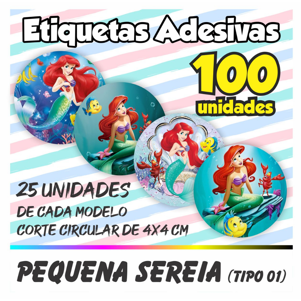| Kit De 100 Etiquetas Adesivas Ariel, Pequena Sereia este produto | R$ 21,90 | — | 4.9/5 | 18 |