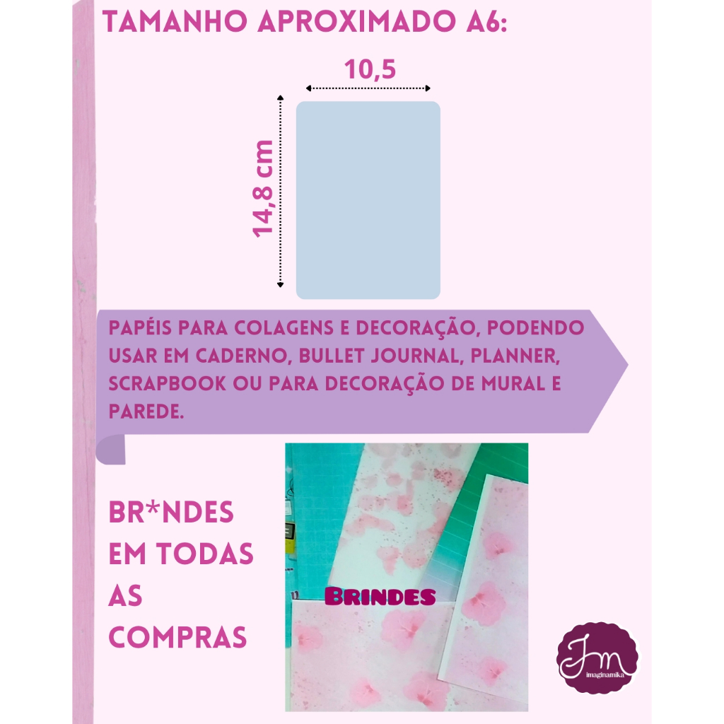 Papéis para colagens e decoração, podendo usar em caderno, Bullet Journal, planner, scrapbook ou para decoração de mural e parede. Imagens e colagens montadas e selecionadas pela imaginamika 19 Papeis no tamanho A6(14,8 cm x 10,5cm - é menor que o kit A5) : 16 papeis offset com artes IMPRESSAS diferenciadas(arte somente em um lado do papel), GRAMATURA 90G OU 120G, ESCOLHER OPÇÃO! 1 papel Kraft 80g; 1 papel reciclável 90g; 1 papel manteiga 90g; **É possível de haver pequenas variações de cores em comparação com a imagem ilustrativa.
