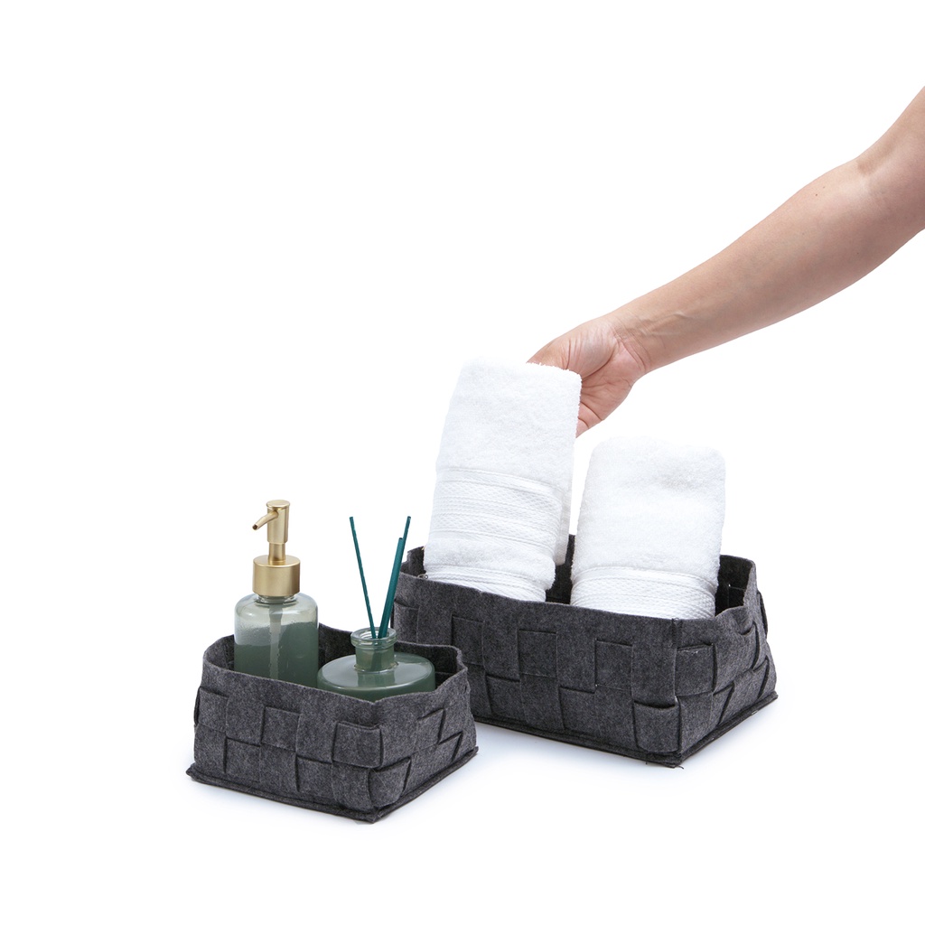 Esse é o kit cesto feltro retangulares 2pcs da OIKOS. Contém 2 tamanhos: pequeno (15,5x11,5x18cm) e grande (23x18x10cm). Kit: 2 cestos que podem ser usados em conjunto ou separados ;) facilita muito a organização no dia a dia. Prático e multiuso: o tamanho grande é ótimo para guardar mantas enroladinhas, lenços e acessórios, já o tamanho pequeno pode ser usado para organizar maquiagens, acessórios, itens de higiene pessoal e muito mais. Detalhe do material: o toque suave do feltro traz mais conforto e aconchego para a casa. e o tom de cinza é bem neutro, combinado com diversos estilos de decoração. Versáteis: vão bem em qualquer ambiente da casa: na sala, no quarto, no escritório, no banheiro. você que manda! Funcional: esses cestos deixam tudo em ordem, sem falar que otimizam os espaços e ainda trazem um ar mais convidativo para cada cantinho.