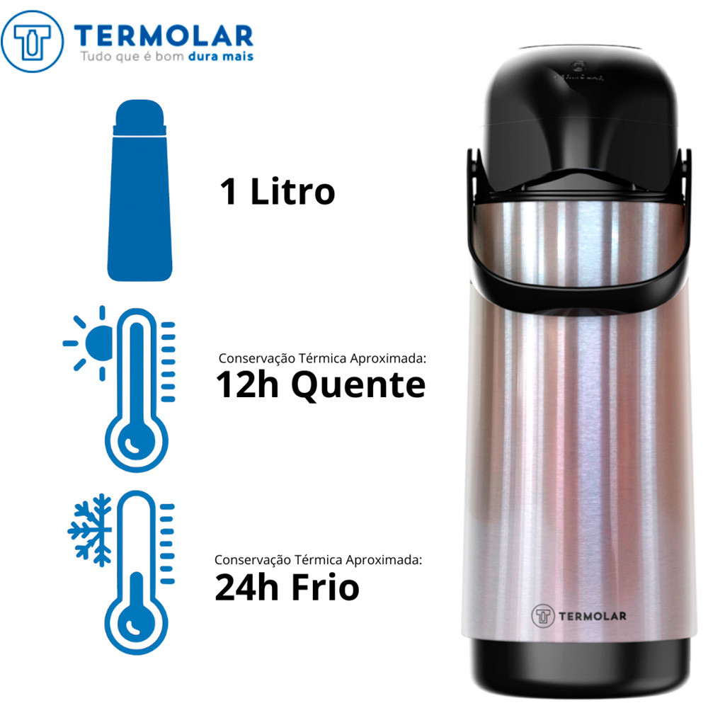 O que está adquirindo 02 Garrafas Térmicas Termolar Lúmina Inox 1L, bomba de pressão, ampola de vidro, conservação quente 12h e frio 24h Descrição do Produto Garrafa térmica de bomba com exterior em inox protegido por verniz, oferecendo alta conservação térmica e jato forte sem pingar. Ideal para uso diário em ambientes domésticos ou corporativos. Especificações Técnicas Capacidade: 1L (cada) Conservação: Quente 12h | Frio 24h Material Externo: Inox com verniz protetor Isolamento: Ampola de vidro Sistema de Servir: Bomba de pressão Modelo: Lúmina Cor: Inox com preto Código: 9751E Livre de BPA: Sim Material Atóxico: Sim Dimensões Aproximadas (por unidade): 31,3 × 11,8 × 14,4 cm Acabamento: Liso Marca: Termolar Garantia: 90 dias Aplicações Recomendadas Cozinhas e copa Escritórios Salas de reunião Consultórios Eventos e recepções Manuseio e Manutenção Use sempre na vertical para evitar vazamentos Escalde por 2 min antes de colocar líquidos Evite choque térmico e exposição ao sol Limpe internamente com bicarbonato e água quente Não usar micro-ondas, lava-louças ou produtos abrasivos SKU: KIT2902 Garantia: Os componentes plásticos são garantidos por 90 dias contra defeitos de fabricação. Não incluem na garantia problemas por uso indevido do produto ou quebras.